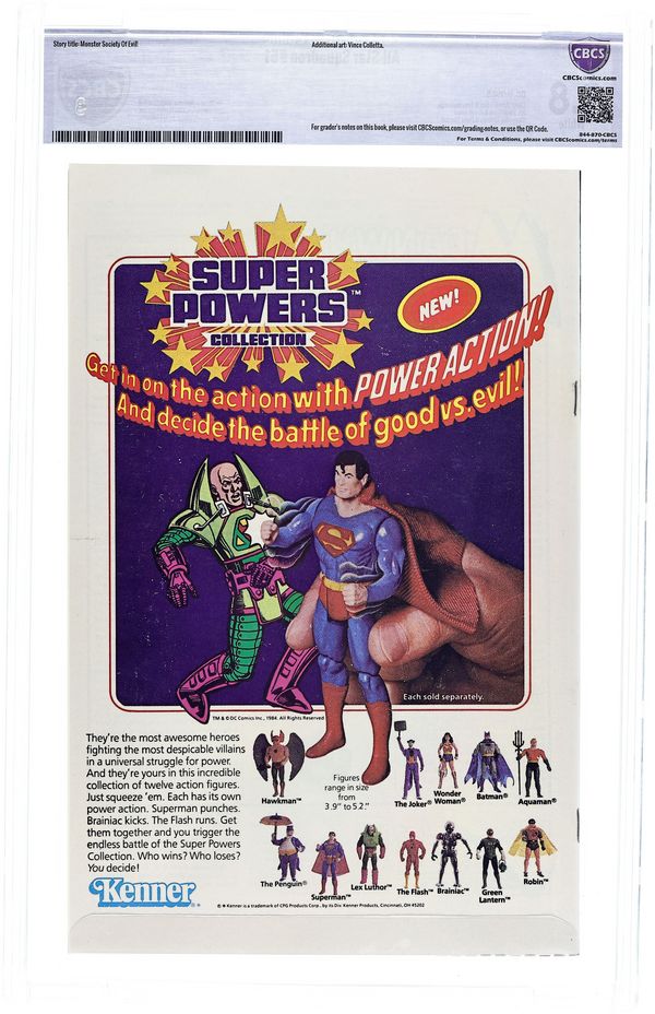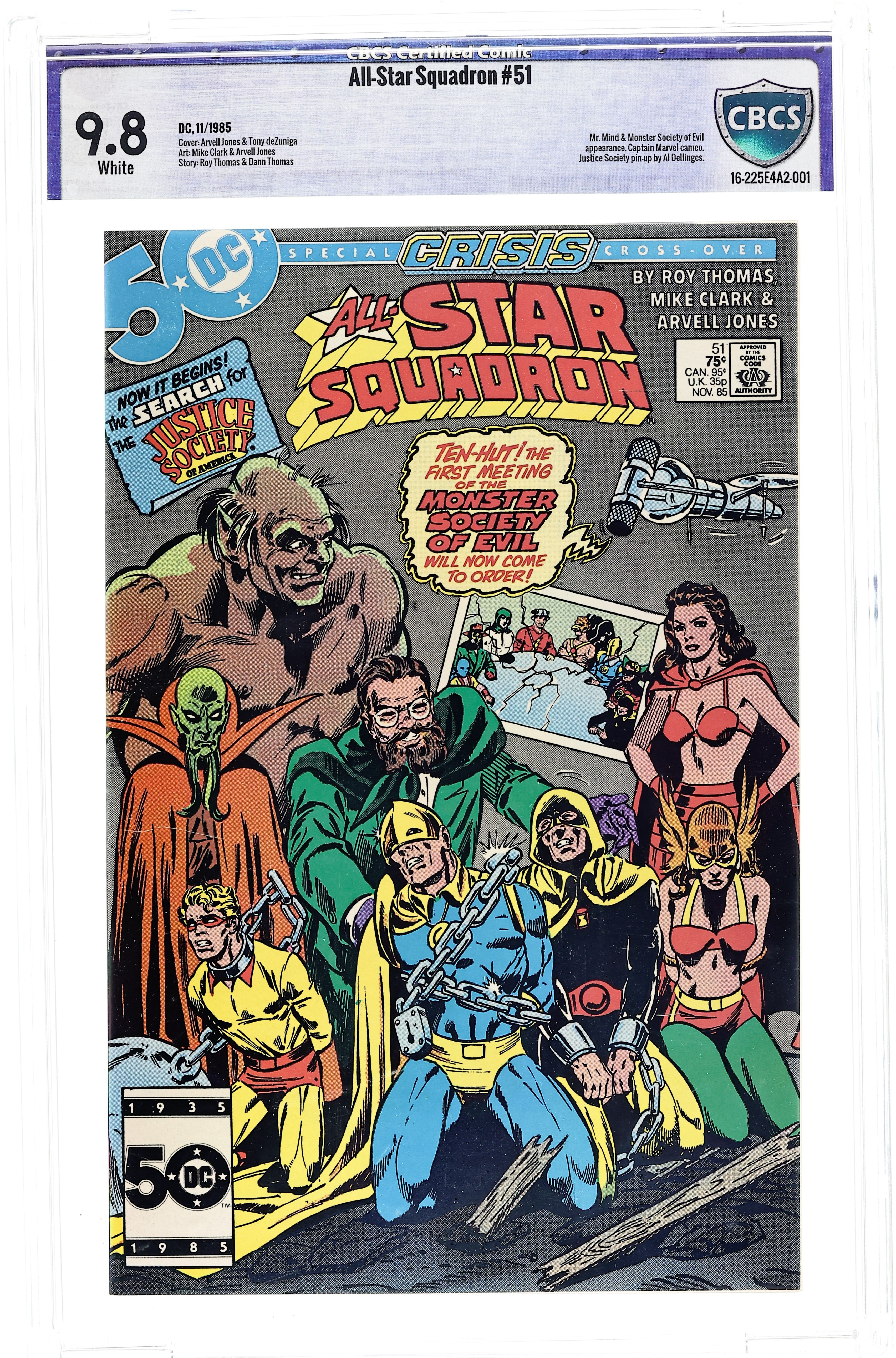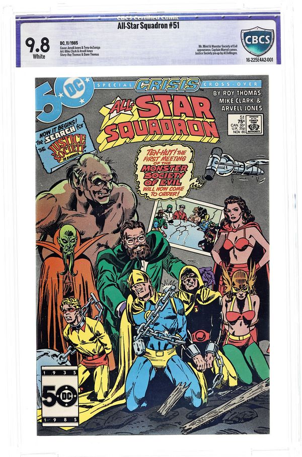 Crisis on Infinite Earths cross-over. Cover pencils by Arvell Jones, inks by Tony deZuniga. Monster Society of Evil!, script by Roy Thomas and Dann Thomas (co-plotter), pencils by Mike Clark (pages 1-21) and Arvell Jones (page 22), inks by Vince Colletta; Mister Mind convenes a new Monster Society of Evil, including Oom, Doctor Who, Nyola, and Ramulus (nee Nightshade, a Sandman villain); The search for the JSA also begins here, as Sandy and Hawkgirl arrive to a damaged JSA hq, only to see the Monster Society inside, and wonder what has become of the JSA'ers, since they only see a captured Dr. Fate and Hourman inside as well. All Star Comics #13 Cover Recreation, pencils by Jack Burnley (original) and Al Dellinges (recreation), inks by Al Dellinges. 36 pgs. $0.75. Cover price $0.75.