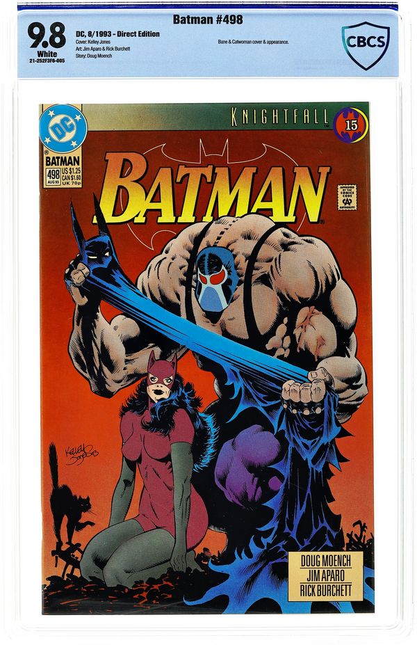 Direct Edition with Overlay cover. Bane breaks Batman's back in Batman KnightFall Part 11. Home turf does not prove an advantage when Bane breaks Batman's back in the Batcave in "The Broken Bat." KnightFall continues in Detective Comics (1937- ) #664. Written by Doug Moench. Pencils by Jim Aparo. Inks by Dick Giordano. Cover by Kelley Jones. 36 Pages, Full Color. Cover price $1.25.