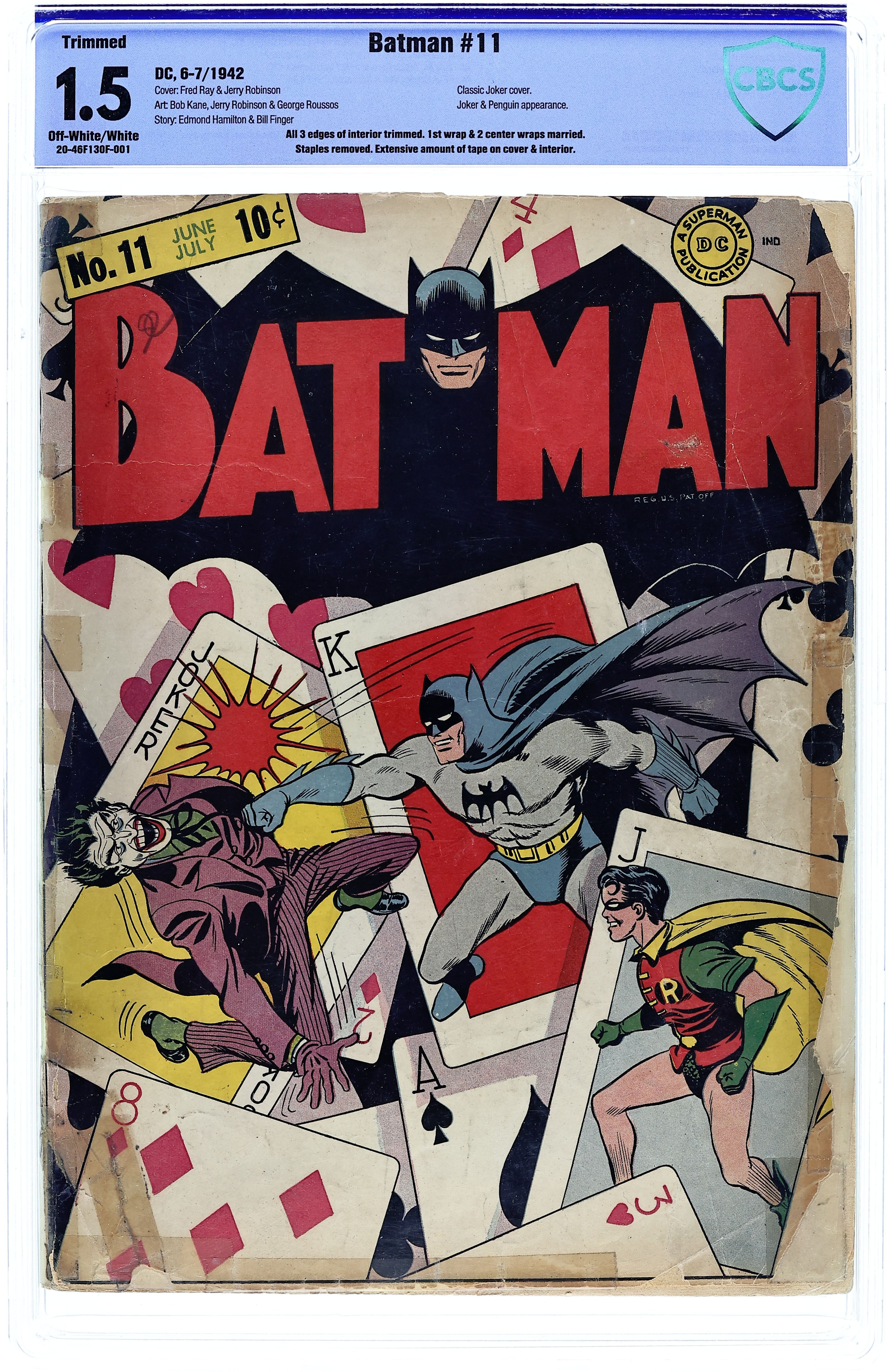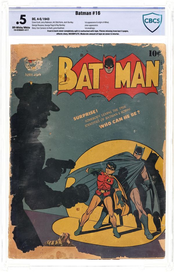 1st appearance of Alfred Pennyworth - Cover by Jerry Robinson. "The Joker Reforms!", script by Don Cameron, pencils by Bob Kane, inks by Jerry Robinson and George Roussos; After robbing a jewelry store, the Joker crash-lands his escape plane and loses his memory; He stumbles into a town where he becomes a hero... but not to the other members of his gang, who seek the jewels, and come looking for him, as do the Caped Crusaders. One-page Shorty story by Henry Boltinoff. "The Grade A Crimes!", script by Ruth "Bunny" Lyons Kaufman (as Bunny Lyons), pencils by Jack Burnley, inks by Jack Burnley and Ray Burnley (backgrounds); After a series of early-bird robberies, Batman notes the appearances of a milkman and his horse-drawn wagon at the scene of every crime, and makes the connection that it is involved in the heists. "The Adventure of the Branded Tree!", script by Don Cameron, pencils by Jack Burnley, inks by Jack Burnley and Ray Burnley (backgrounds); Batman and Robin track down the secret of a dagger-branded tree that led to the murder of two lumberjacks. "Motive" text story by Eric Carter. One-page Clancy the Cop story by Henry Boltinoff. "Here Comes Alfred!", script by Don Cameron, pencils by Bob Kane, inks by Jerry Robinson and George Roussos (backgrounds); Things get very complicated when an English butler, named Alfred, suddenly shows up on the doorstep of Wayne Manor and announces that he is there is attend to their needs in order to fulfill a promise that he made to the original butler for the Wayne family. 68 Pages, Full Color. Cover price $0.10.