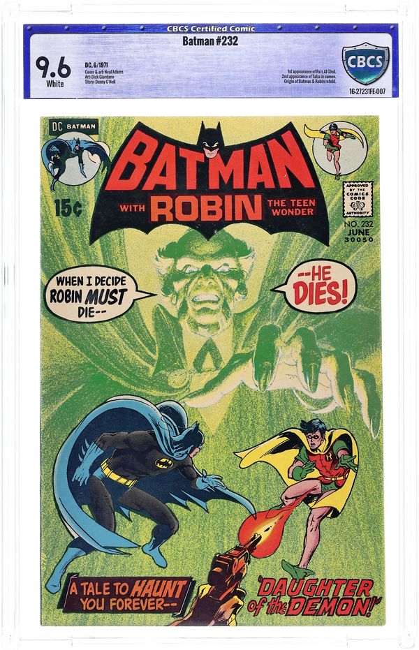 1st appearance of Ra's Al Ghul. Last 15-cent cover price. Cover by Neal Adams. "Daughter of the Demon," script by Denny O'Neil, pencils by Neal Adams, inks by Dick Giordano; Origin of Batman and Robin retold; Robin returns home from a night of adventuring; Two gunmen armed with tranquilizer darts shoot the Boy Wonder and take him prisoner; Later, Bruce Wayne receives a photograph of his kidnapped partner and a challenge to find him; Ra's Al Ghul contacts deduce that Bruce Wayne and the Batman are one in the same; He calls upon the world's greatest detective to help him find his daughter Talia, who also has been kidnapped. Letter to the editor by Mike W. Barr. 36 Pages, Full Color. Cover price $0.15.