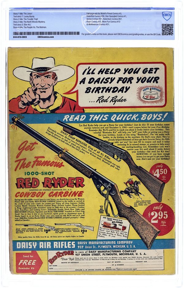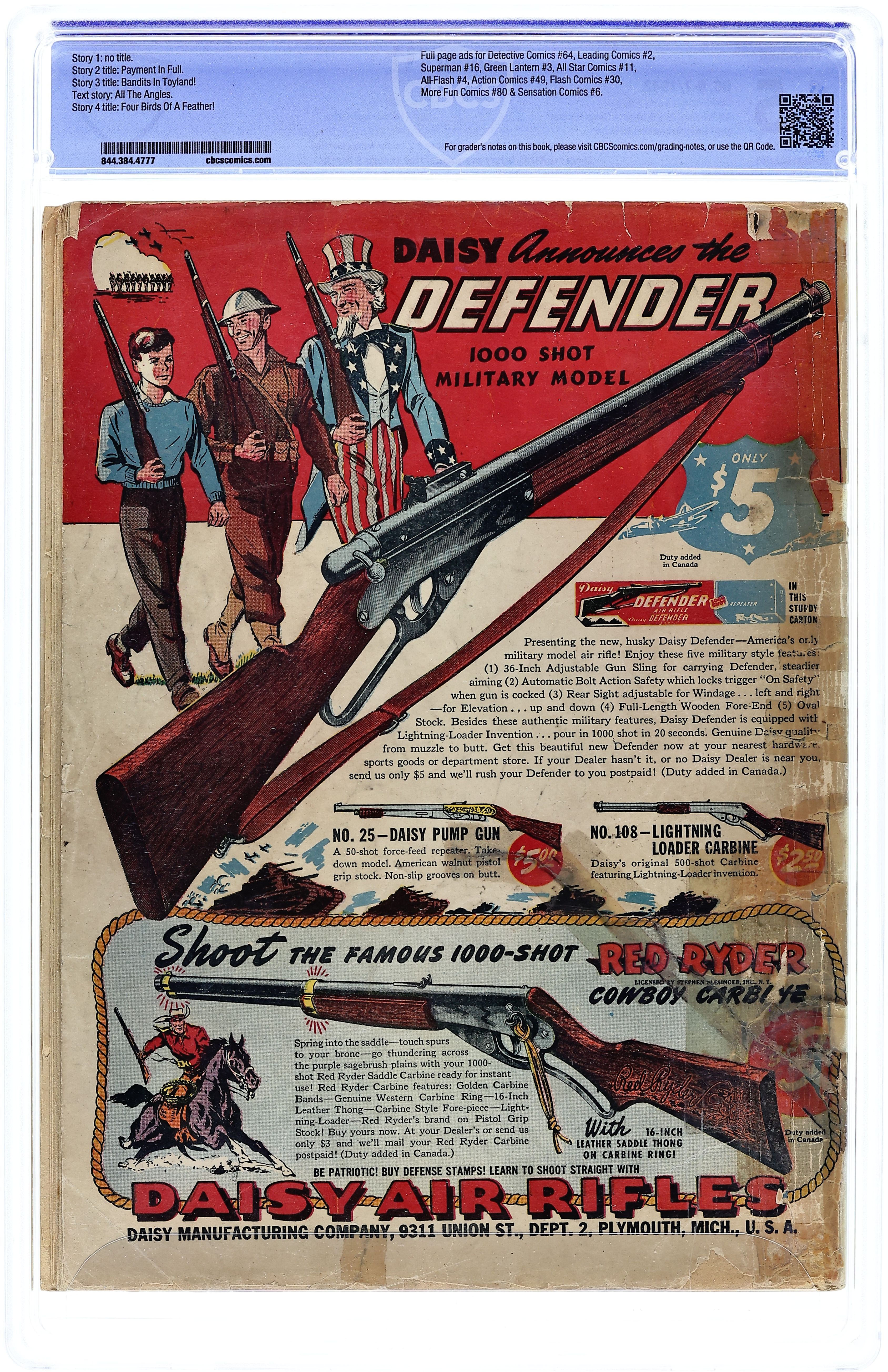 Cover pencils by Fred Ray, inks by Jerry Robinson. "The Joker's Advertising Campaign," script by Bill Finger, pencils by Bob Kane, inks by Jerry Robinson and George Roussos (backgrounds); The Joker escapes from prison and places ads each day in the newspaper to advertize to Batman and Robin his latest criminal pursuit. 1-page Clancy the Cop story by Henry Boltinoff. "Payment In Full," script by Bill Finger, pencils by Bob Kane, inks by Jerry Robinson and George Roussos (backgrounds); Batman discovers that the D.A. faces one of the most difficult decisions of his life: to persecute and send to the chair a criminal who once saved his life. "Bandits In Toyland!", script by Edmond Hamilton, pencils by Bob Kane, inks by Jerry Robinson and George Roussos (backgrounds); Bruce Wayne is called to immediate jury duty and discovers that the defendant has been framed. "All the Angles" text story by Edgar Wilton. "Four Birds of a Feather!", script by Bill Finger, pencils by Bob Kane, inks by Jerry Robinson and George Roussos (backgrounds); The Penguin joins in a financial enterprise with some "old friends" of his to open a night club called The Bird House in Florida.... with gambling as the real racket. 68 Pages, Full Color. Cover price $0.10.