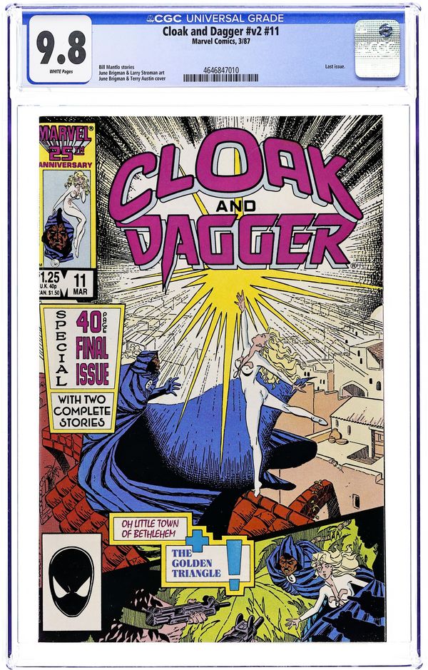 Cover pencils by June Brigman, inks by Terry Austin. O Little Town of Bethlehem, script by Bill Mantlo, pencils by June Brigman, inks by Terry Austin; The trail of the drugs for weapons trade leads Cloak and Dagger to Bethlehem where Bill Clayton's role is revealed. Clayton, finally regretting his use of the duo to make money, is killed when he takes a bullet for Dagger. The Golden Triangle, script by Bill Mantlo, pencils by Larry Stroman, inks by Randy Emberlin; Cloak and Dagger follow the drug smuggling trade to it's end: the opium fields of Cambodia. Series continues in Strange Tales (1987 series) #1. 52 pgs. $1.25. Cover price $1.25.