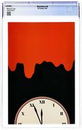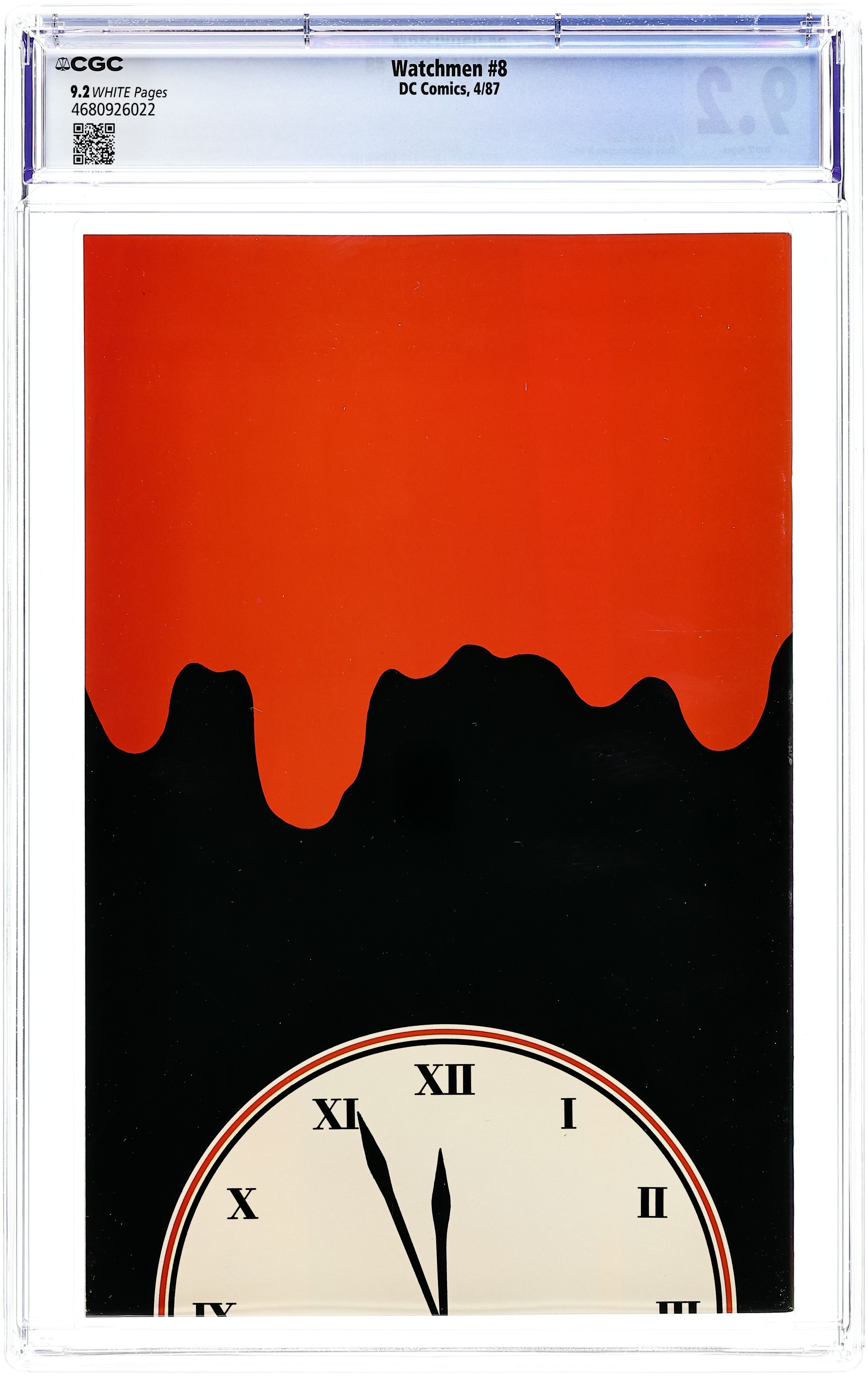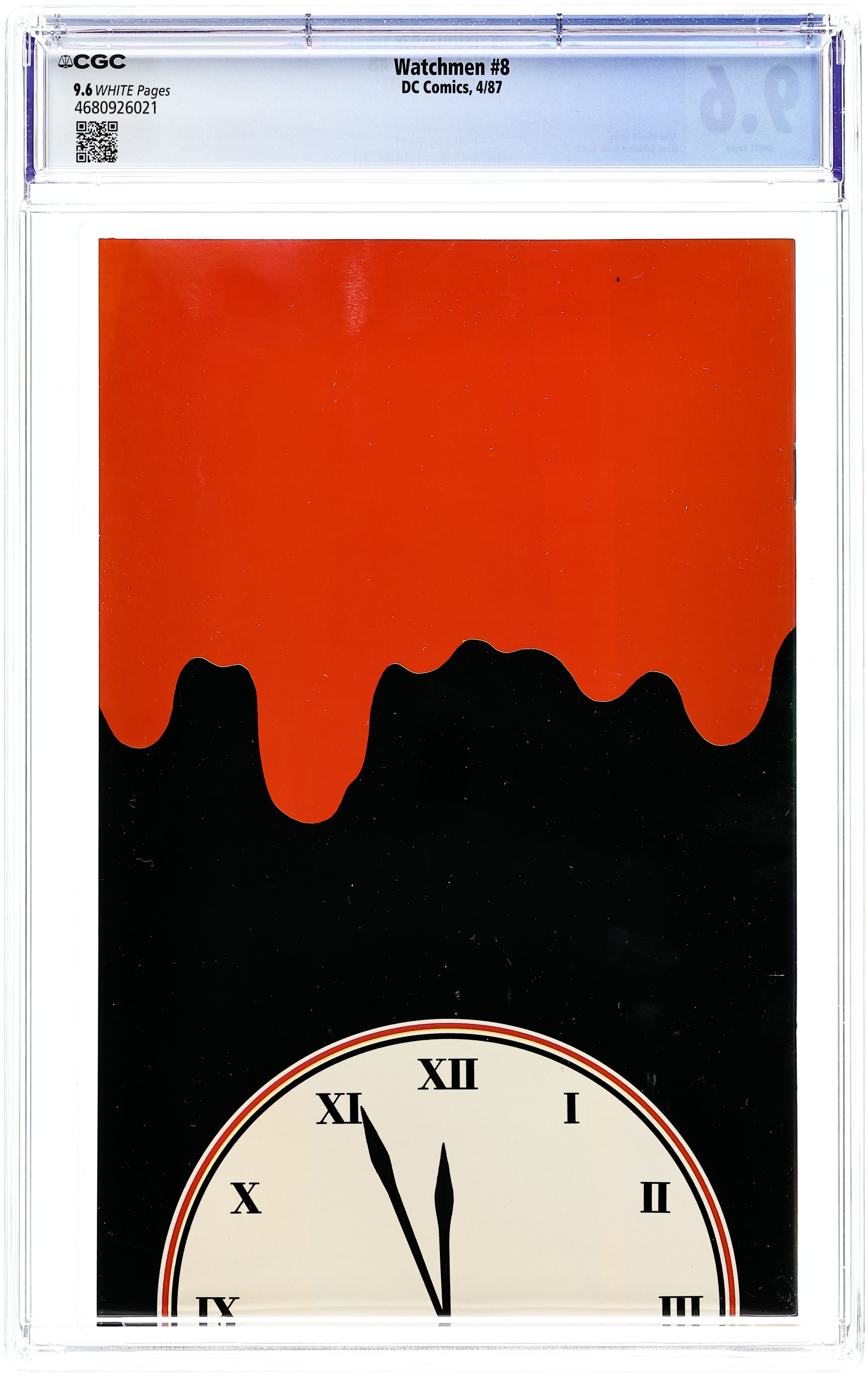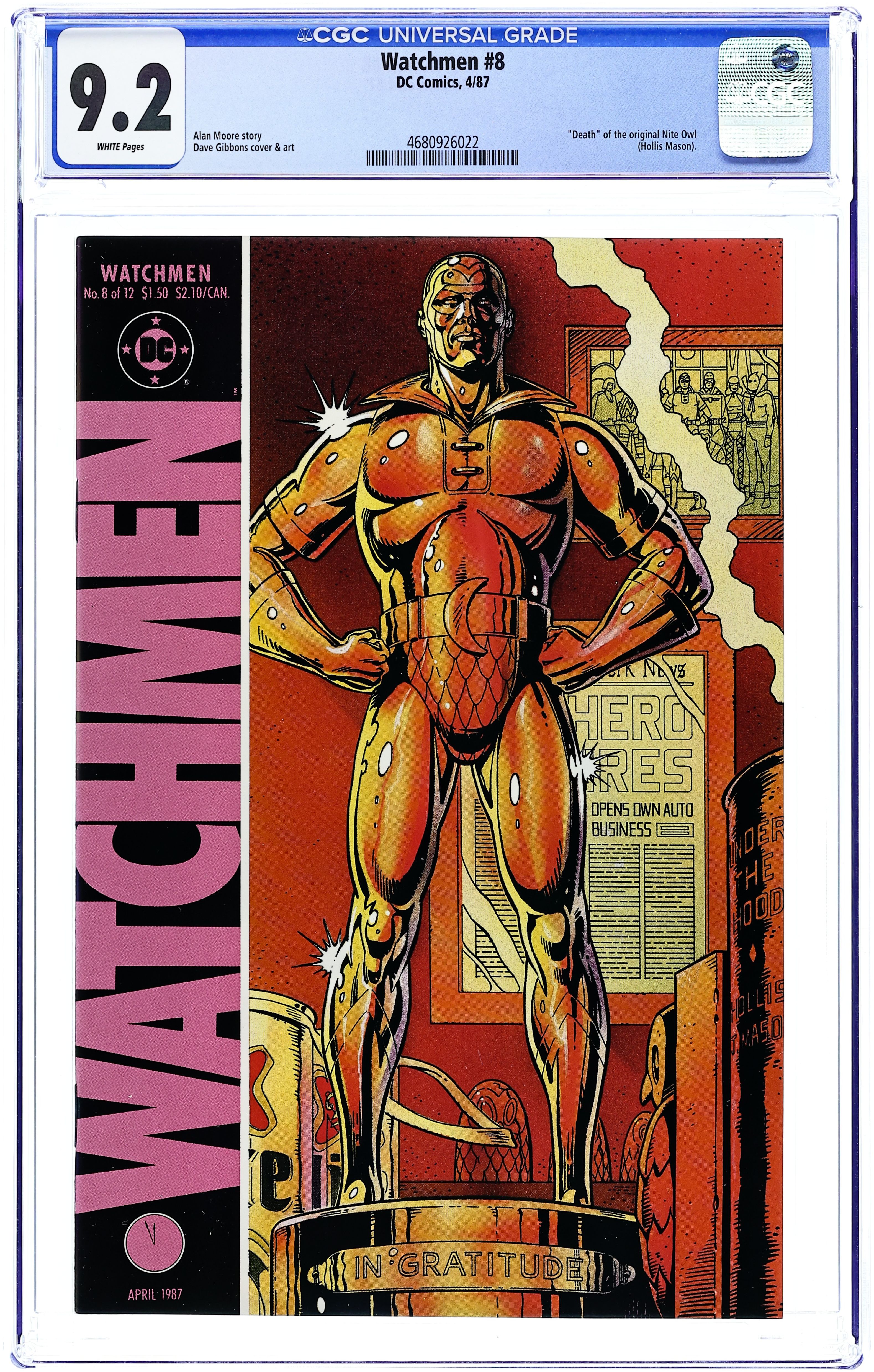 "Old ghosts". Part 8 of 12. Story by Alan Moore. Art and cover by Dave Gibbons. Silk Spectre and Night Owl attempt to free Rorschach from prison as the world slips deeper into chaos and closer to war. Includes four page fictional text feature showcasing a mock up of the next issue of, "The New Frontiersman". 32 pages. Full color. No ads. Cover price $1.50.