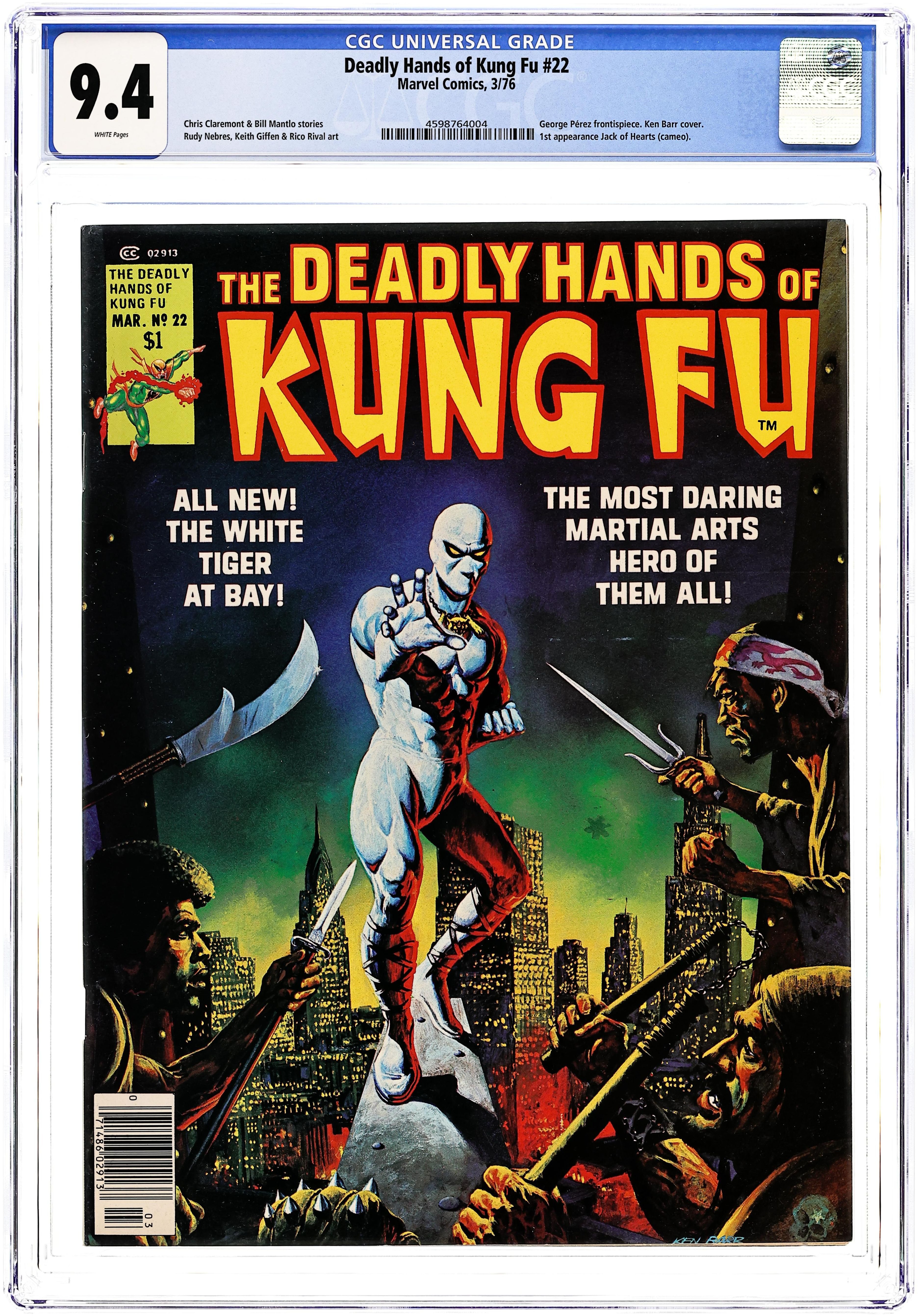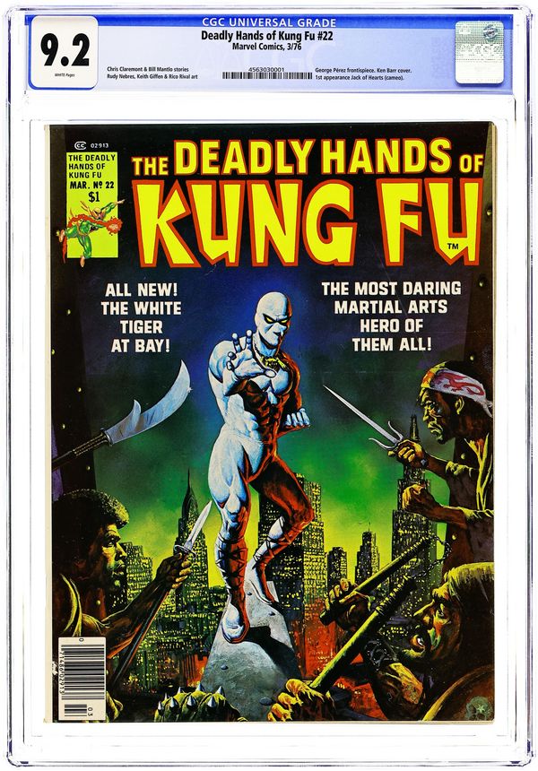 1st appearance by Jack of Hearts. Stan Lee Presents: The Deadly Hands of Kung Fu. Cover by Ken barr. Includes: "Enter the Letters!" A letters page with readers' thoughts on previous issues. An editorial by Archie Goodwin. Iron fist stars in "To Storm the Walls of Hell!" Story by Chris Claremont. Art by Rudy Nebres. "Birth of the Dragon: The Beginnings of Kung Fu!" An article by Steve Clement. "Kung Fu: Cinema of Vengeance!" A book review by David Anthony Kraft. "Fighting Woman: The Myth and Reality!" An article about woman in martial arts by Val Eads. Plus, the Sons of the Tiger star in "Who is the White Tiger?" Introducing the newest martial arts hero the White Tiger. Guest-starring Jack of Hearts (1st app.). Story by Bill Mantlo. Art by Keith Giffen and Rico Rival. Includes a B&W poster by George Perez featuring the Sons of the Tiger and the White Tiger. Black and white. Cover price $1.00.