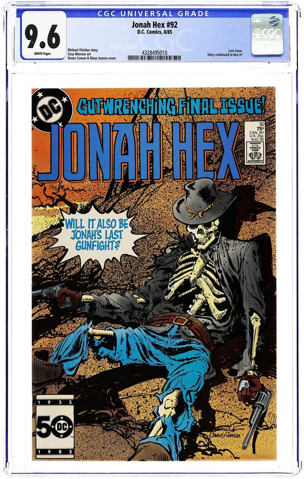Direct Edition. In this last issue of Jonah Hex, Jonah goes out in "A Blaze of Glory!" Hex faces off with villains in the West when he suddenly disappears from the late 1880's and reappears in the 21st century sometime after a nuclear war. Continues in Hex (1985) #1. Written by Michael Fleisher, with art by Gray Morrow. Cover by Denys Cowan and Klaus Janson. Cover price $0.75.