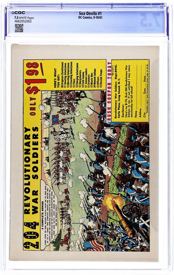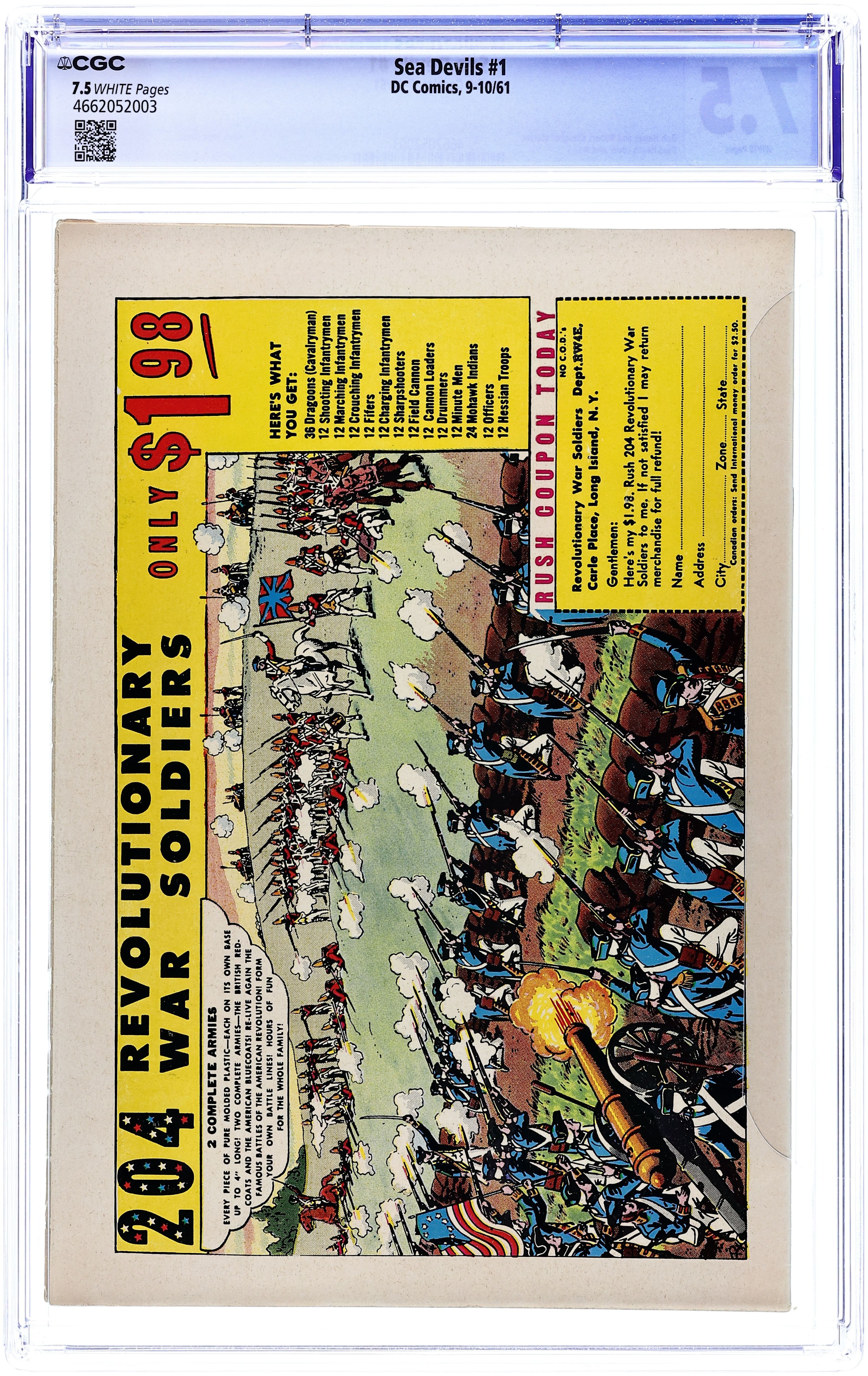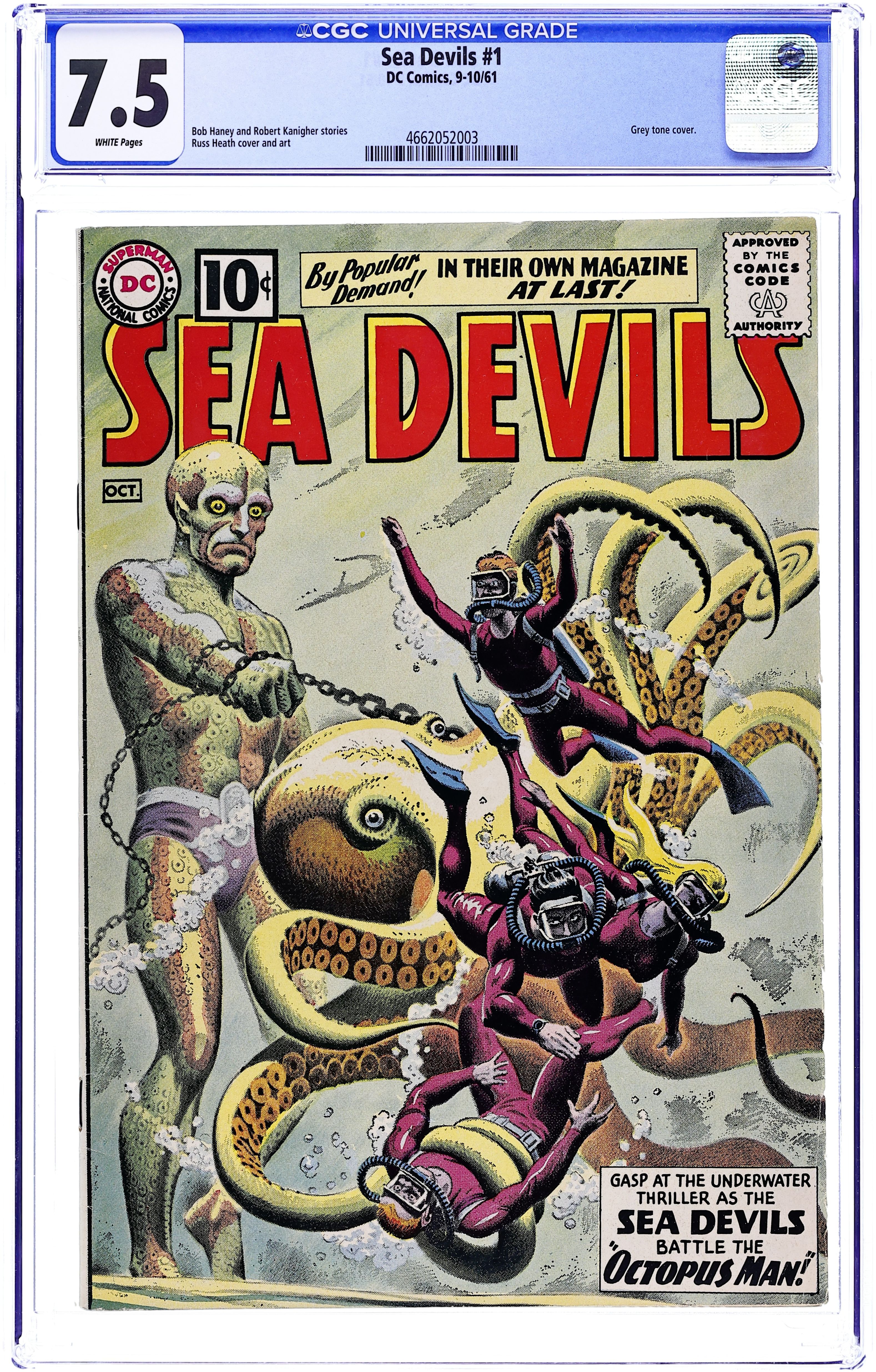 Cover by Russ Heath. "The Sea Devils vs. the Octopus Man!", script by Robert Kanigher, art by Russ Heath; Producer Wendel Wales is shooting a movie about the Sea Devils; His mechanical Octopus Man is destroyed when the real version appears and attacks the movie set. "Secret of the Emerald Whale!", script by Bob Haney, art by Russ Heath; The Sea Devils find an iceberg with the Emerald Whale and Captain Shark frozen inside. 36 pgs., full color. $0.10. Cover price $0.10.
