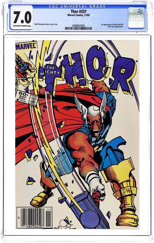 Newsstand Edition. Cover by Walt Simonson. Beta Ray Bill (first appearance) becomes Thor in "Doom!", script and art by Walt Simonson; Nick Fury asks Thor's aid in investigating an alien ship heading for earth; Thor arrives and triggers the awakening of an alien protector, Beta Ray Bill; Bill bests Thor and takes up his hammer only to be accidentally summoned to Asgard by Odin who thinks he is summoning Thor. Brief appearances by Nick Fury, Loki, Sif, Balder, Heimdall, Volstagg, and Odin. First appearance of Lorelei (sister of the Enchantress). Begins Walt Simonson's run on Thor (through #382). Bullpen Bulletins. Star Frontiers TSR ad. 36 pgs., full color. $0.60. Cover price $0.60.