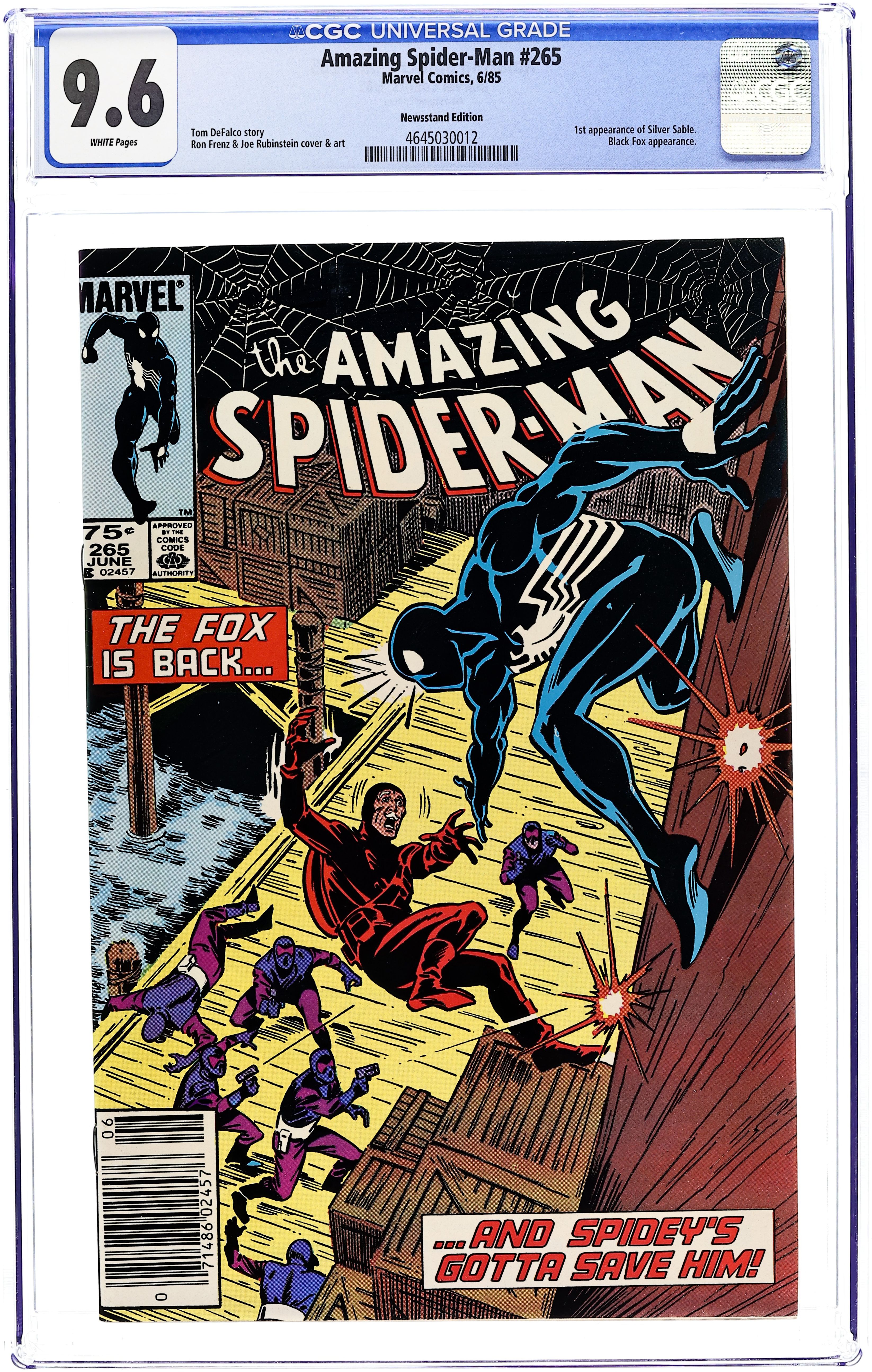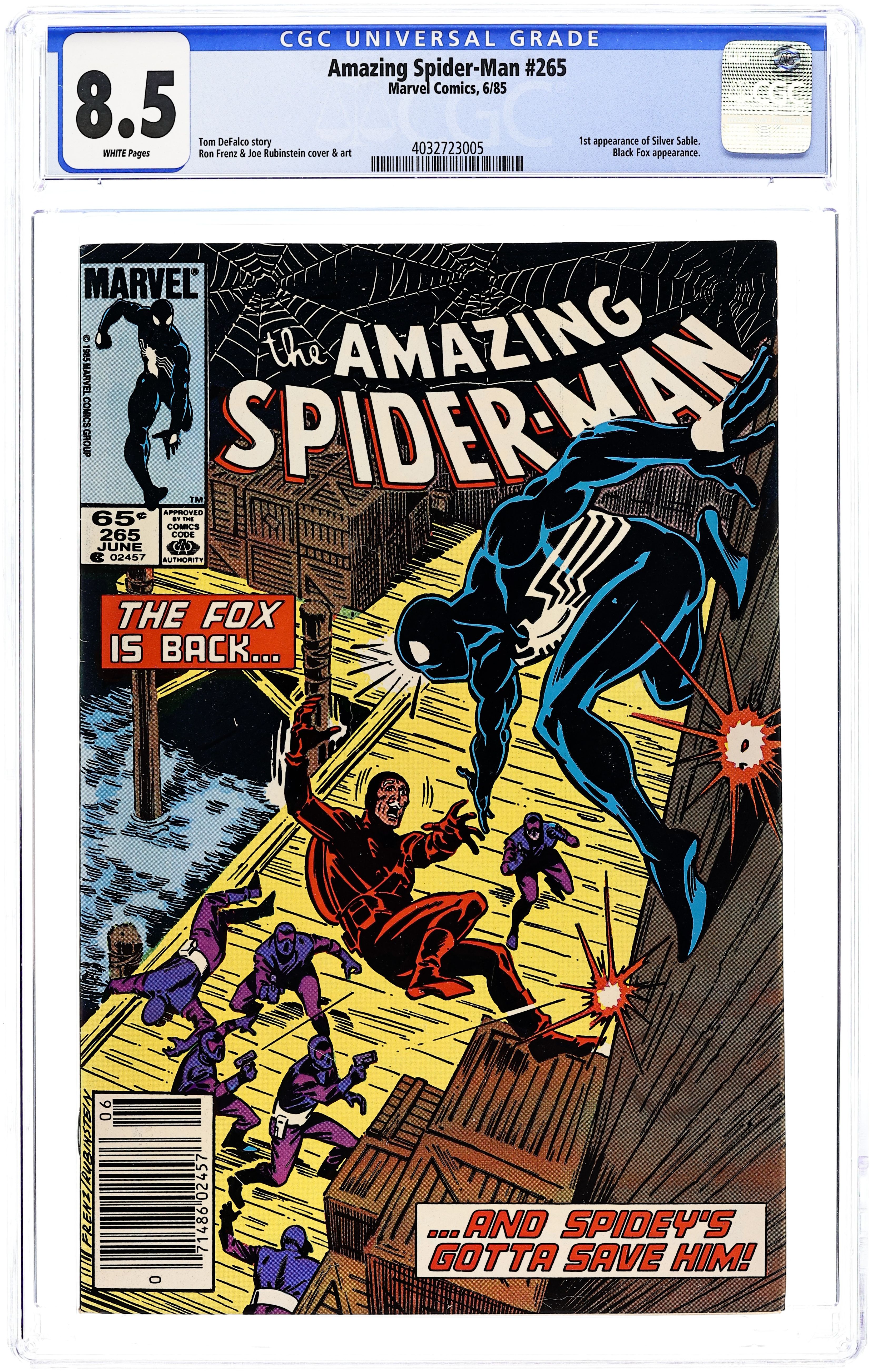 First printing. Newsstand Edition. First appearance of Silver Sable. Script by Tom DeFalco. Pencils by Ron Frenz. Inks by Joe Rubinstein. Cover by Ron Frenz and Joe Rubinstein. "After the Fox!". The Black Fox is on the run! But it's not the Spectacular Spider-Man who's chasing him! It's Silver Sable! An adventurer for hire from the European country of Symkaria! Silver Sable and her Wild Pack pursue the fox through the streets of Manhattan and then later corner him on the waterfront! However, the aging international jewel thief has a wall-crawling guardian angel! Down on the docks, the sparks fly as the web-slinger gives Silver Sable a lesson in diplomacy...superhero-style! Second appearance of the Black Fox. Cameo appearances by Aunt May, Mary Jane Watson, Harry Osborn, Liz Osborn, and Normie Osborn. (Notes: Silver Sable appears next in Amazing Spider-Man 279. The Black Fox returns in Web of Spider-Man 14. There is a second printing of this issue published in 1992. The second printing features a gray cover and a yellow dog ear touting the first appearance of Silver Sable. This story was also reprinted in Marvel Tales 277.) 36 pgs. Cover price $0.65.