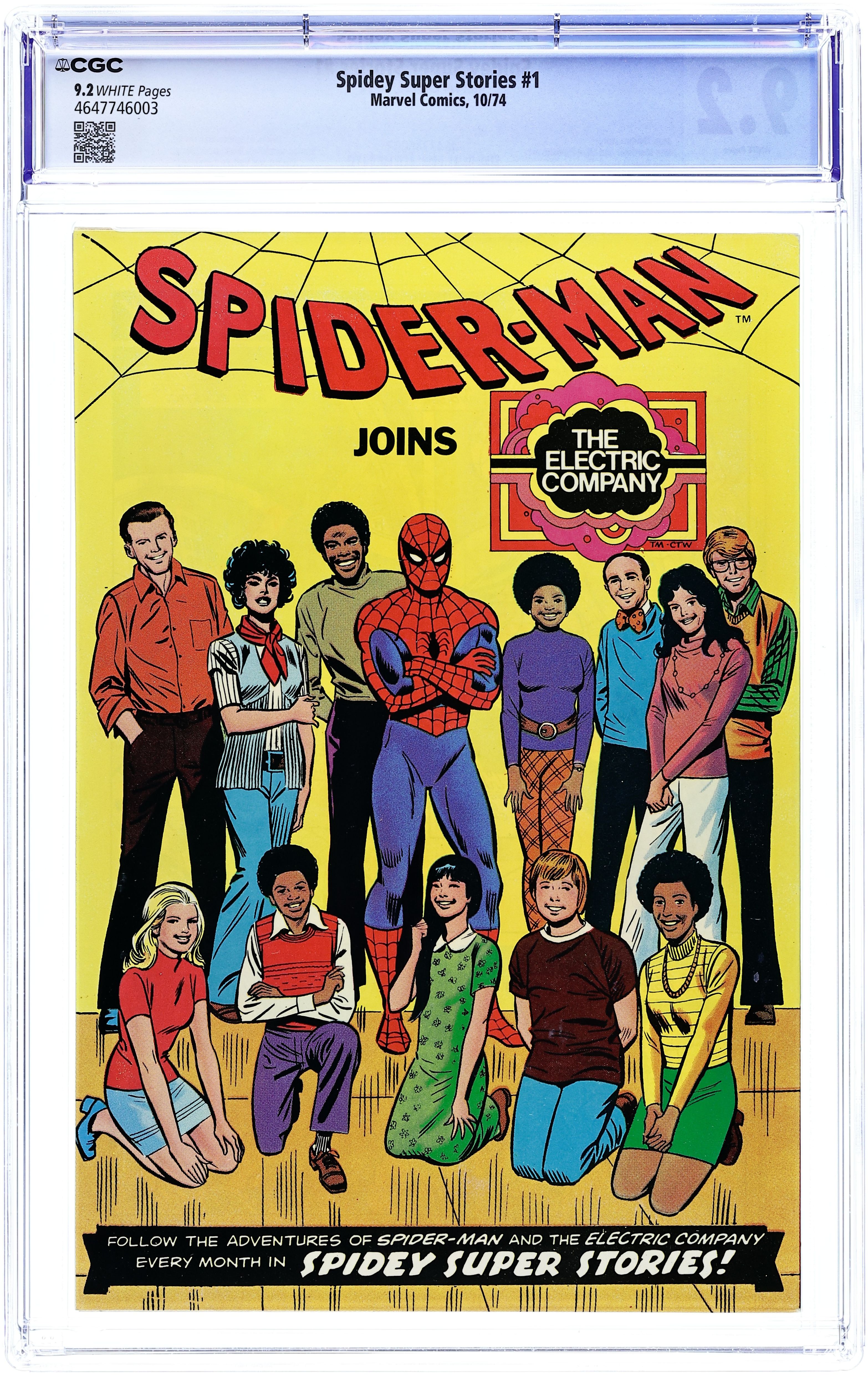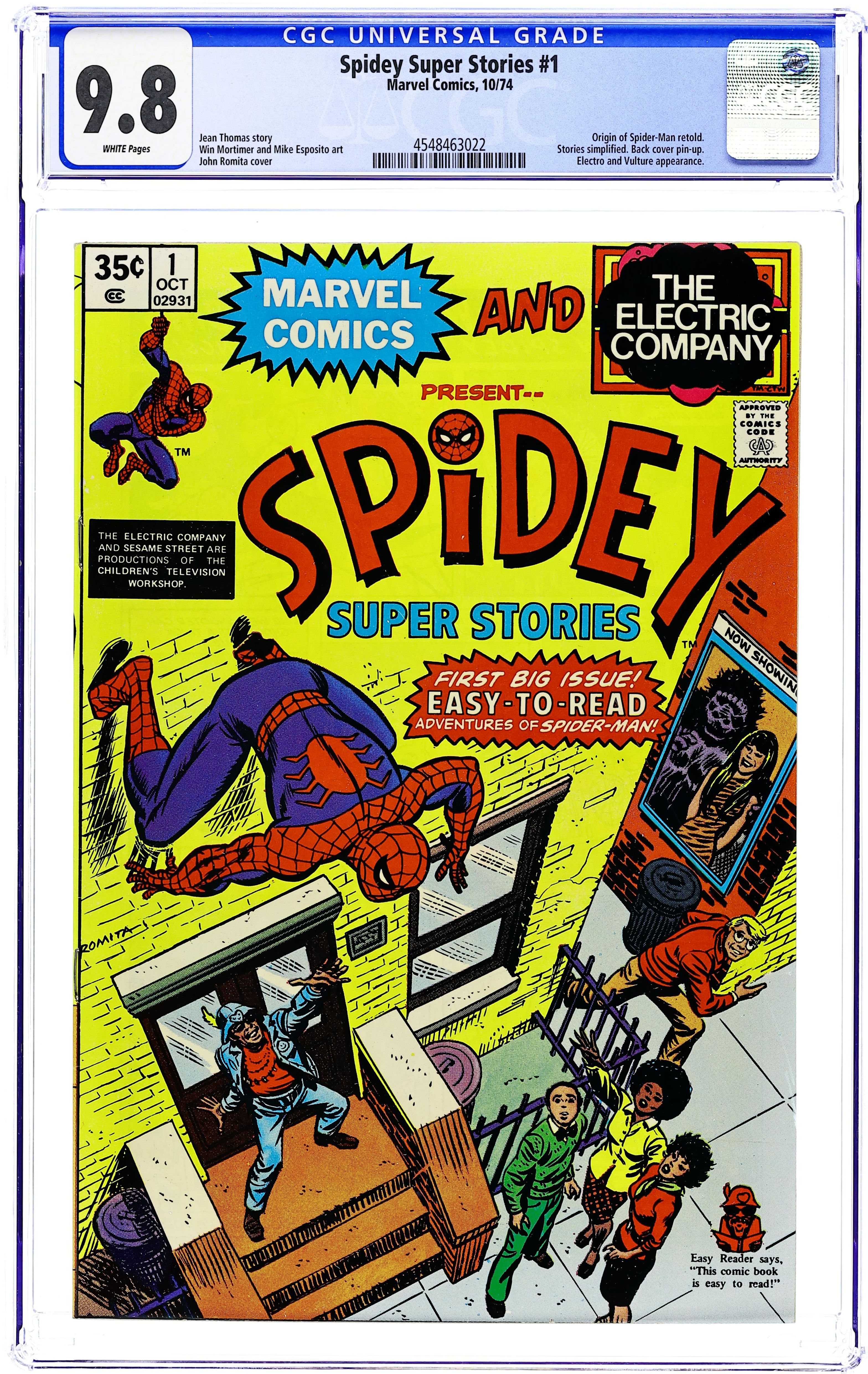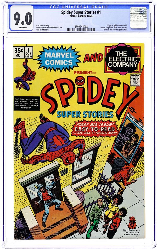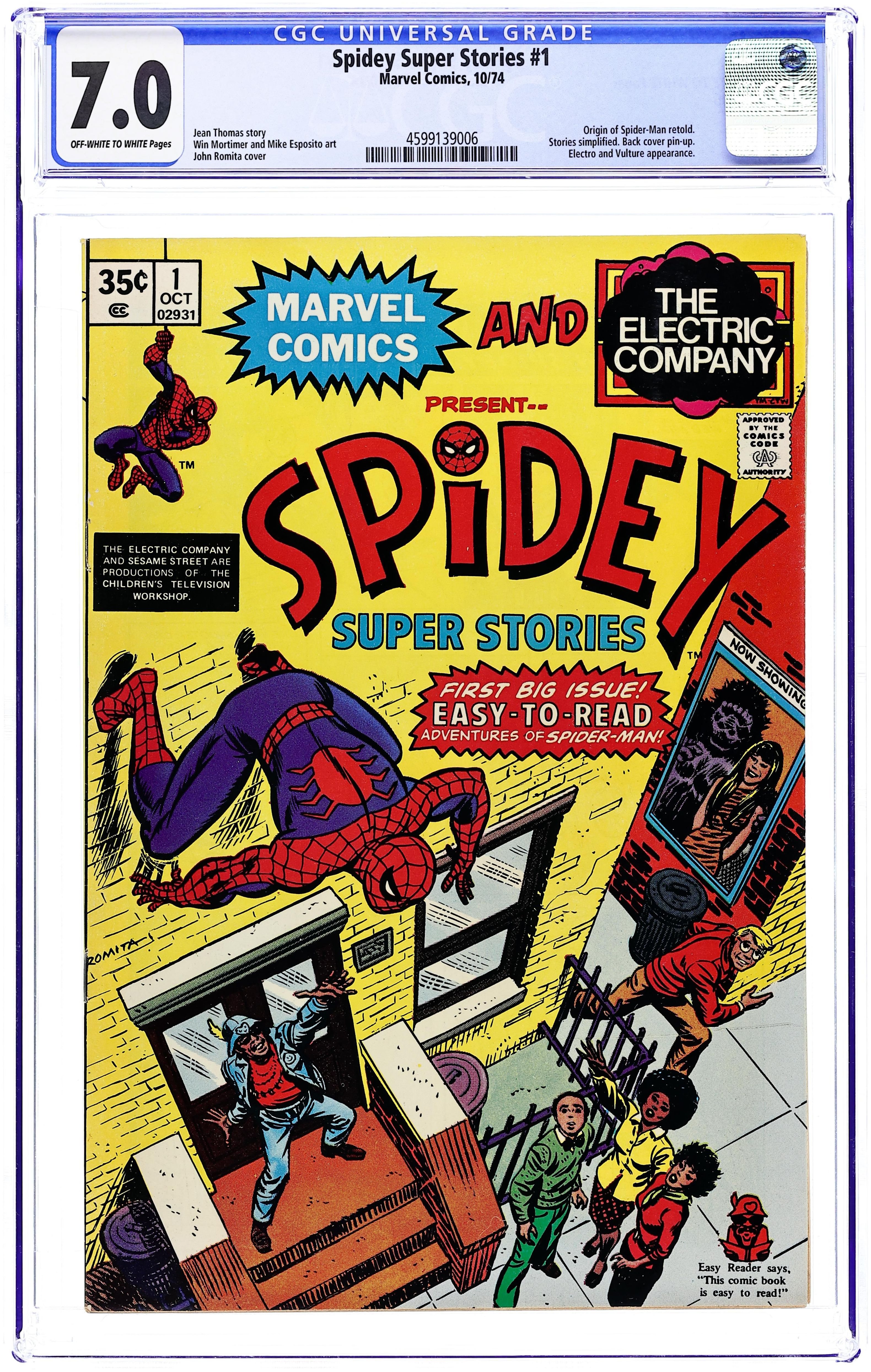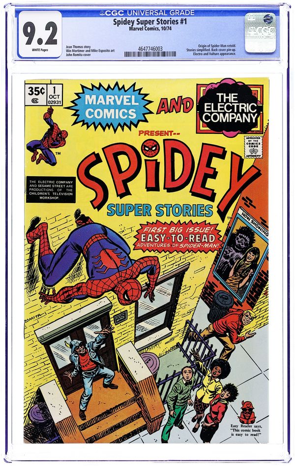 Simplified Spider-Man stories. 11 page origin story, "Spider-Man is Born!" Script by Jean Thomas (with help from Bill Effros, based on the original story by Stan Lee), pencils by Winslow Mortimer, inks by Mike Esposito. Also in this issue: "Spidey Signs Up," "Spidey Meets the Spoiler" (based on the Electric Company script by Tom Whedon), and "Help! I'm Spider-Man!" (based on a story by Byron Preiss). John Romita Sr. cover. Cover price $0.35.