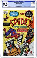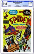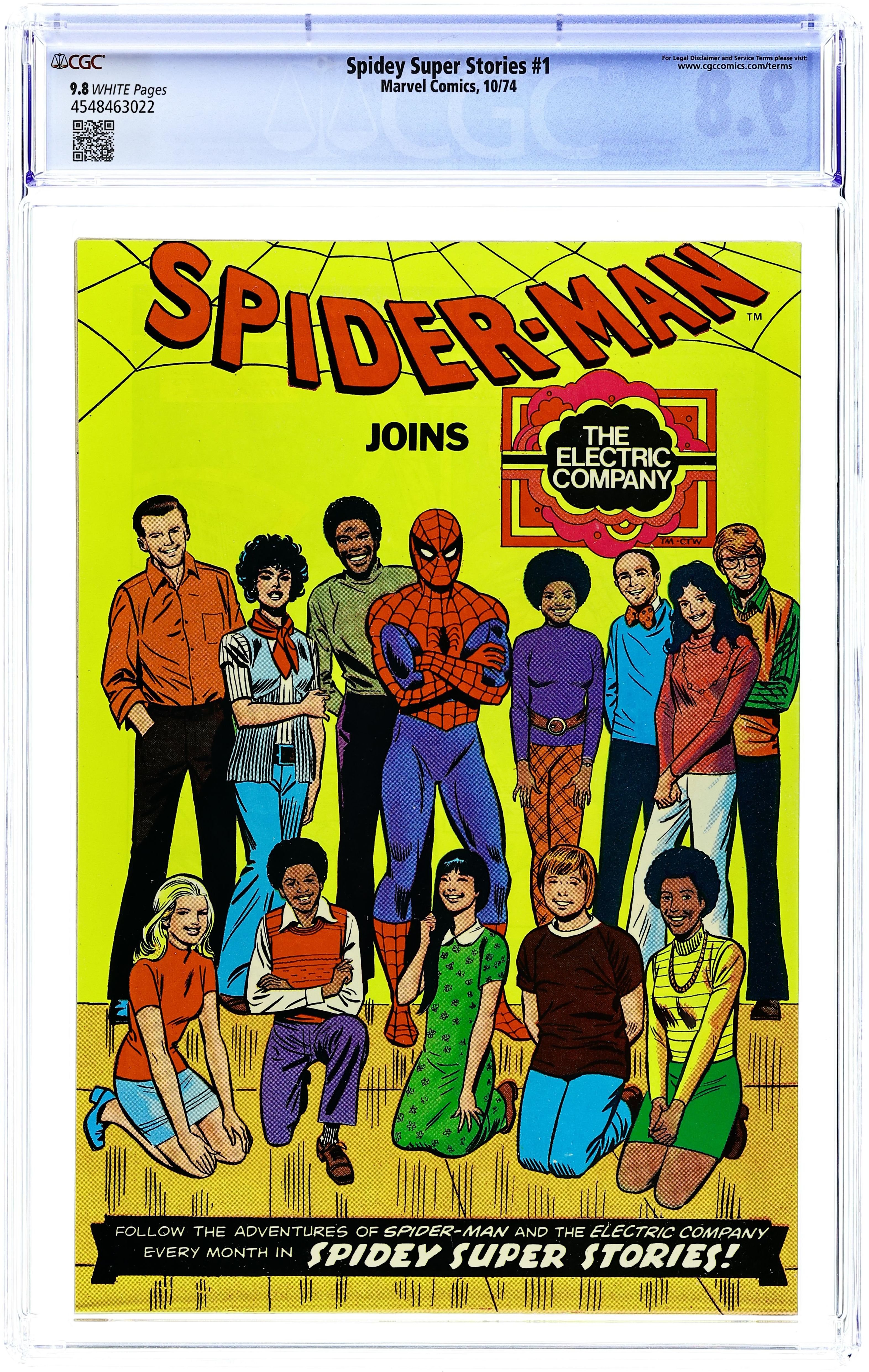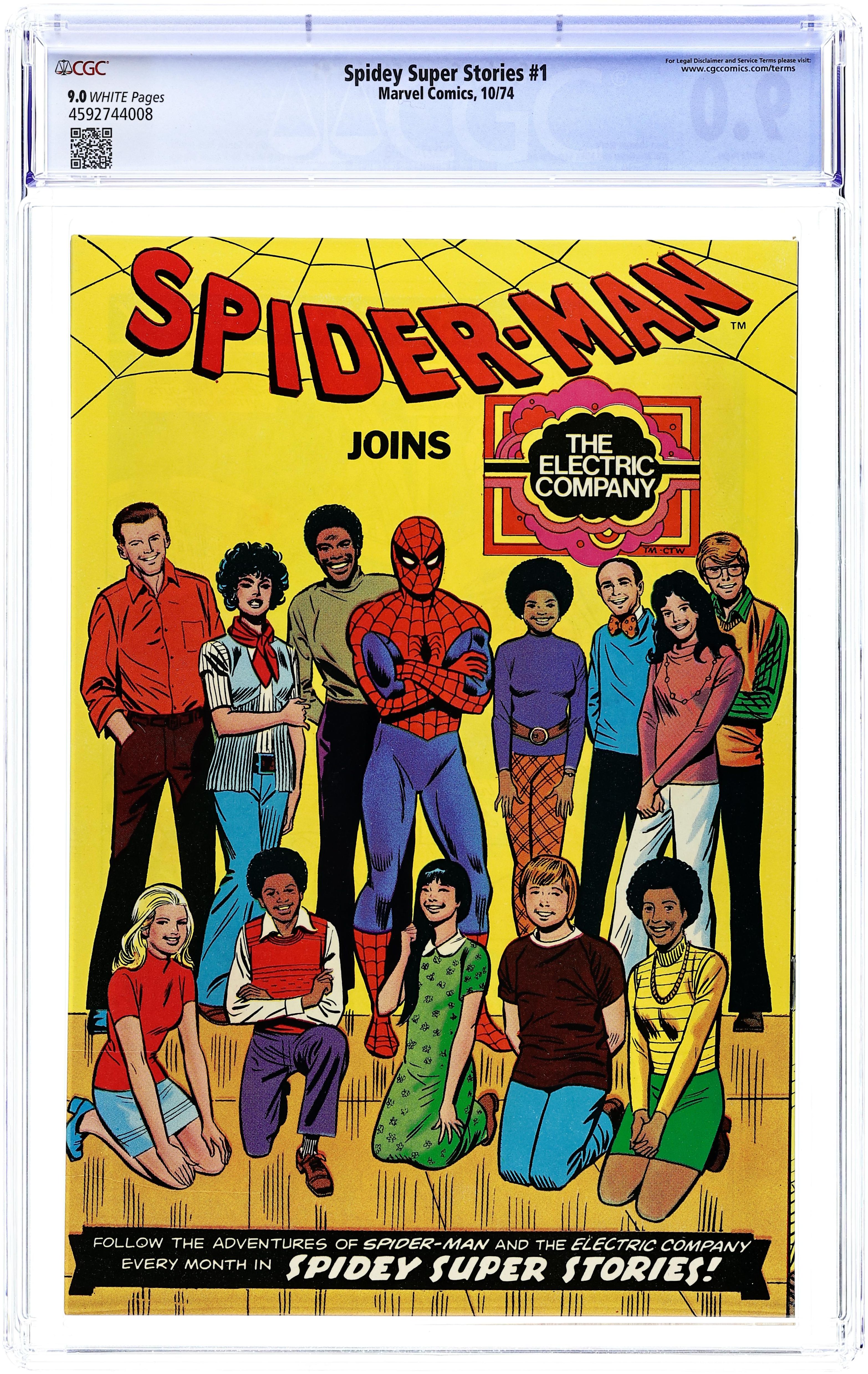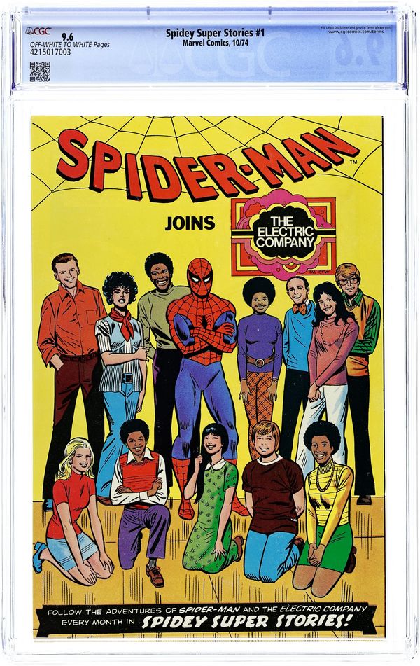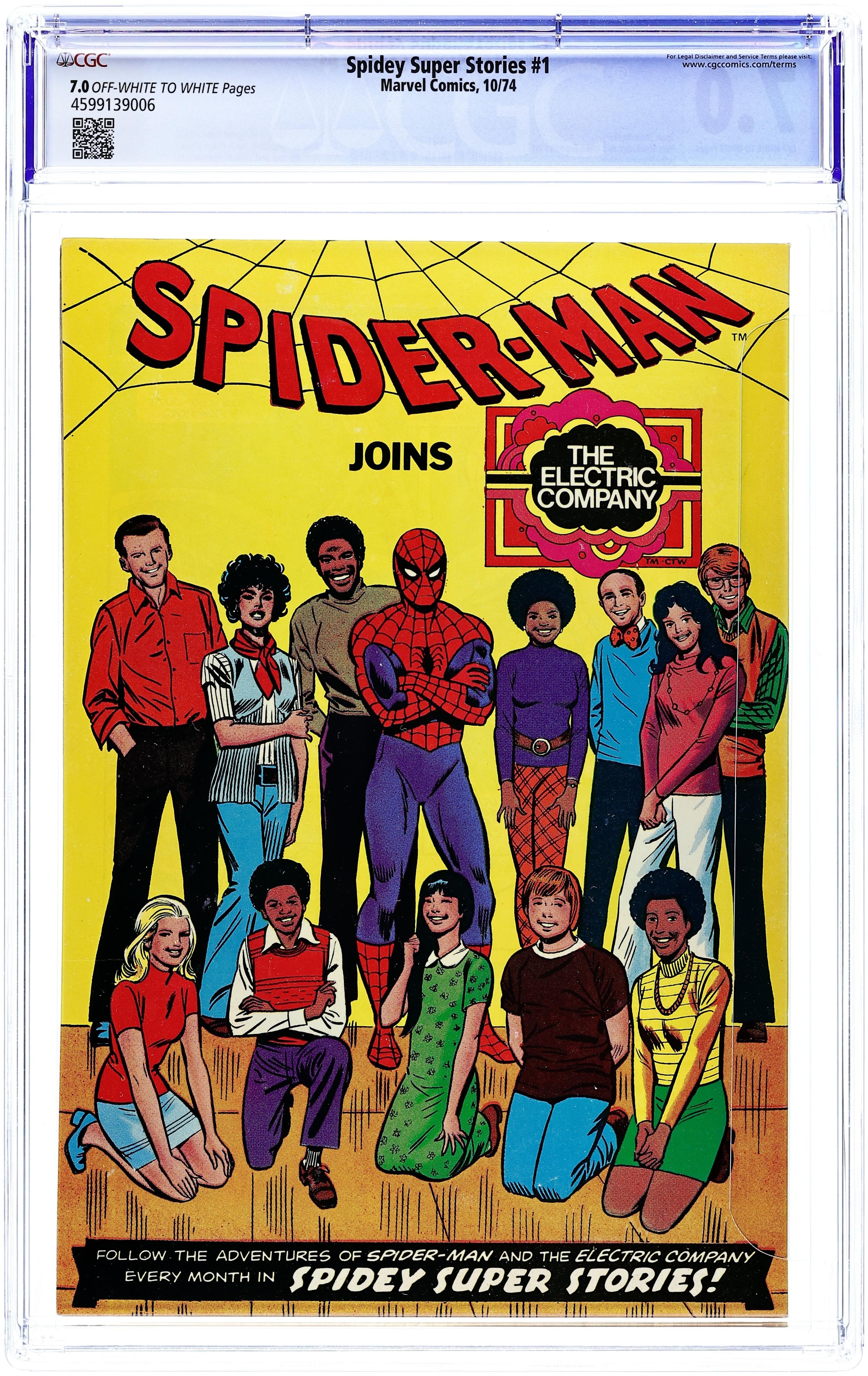 Simplified Spider-Man stories. 11 page origin story, "Spider-Man is Born!" Script by Jean Thomas (with help from Bill Effros, based on the original story by Stan Lee), pencils by Winslow Mortimer, inks by Mike Esposito. Also in this issue: "Spidey Signs Up," "Spidey Meets the Spoiler" (based on the Electric Company script by Tom Whedon), and "Help! I'm Spider-Man!" (based on a story by Byron Preiss). John Romita Sr. cover. Cover price $0.35.