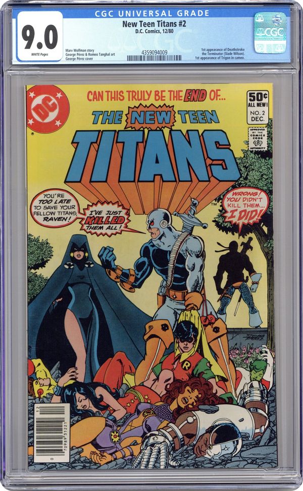 Newsstand Edition. First appearance of Deathstroke the Terminator in "Today...the Terminator!" Characters: Teen Titans [Robin; Kid Flash; Wonder Girl; Cyborg; Starfire; Raven; Changeling]; The Terminator [Slade Wilson] (1st; Later Deathstroke); The Ravager [Grant Wilson] (Intro; Death); Wintergreen (Intro); HIVE. Script by Marv Wolfman, with art by George Perez and Romeo Tanghal. Plus: an article by Marv Wolfman on the revival of the Teen Titans. Cover by George Perez. Cover price $0.50.