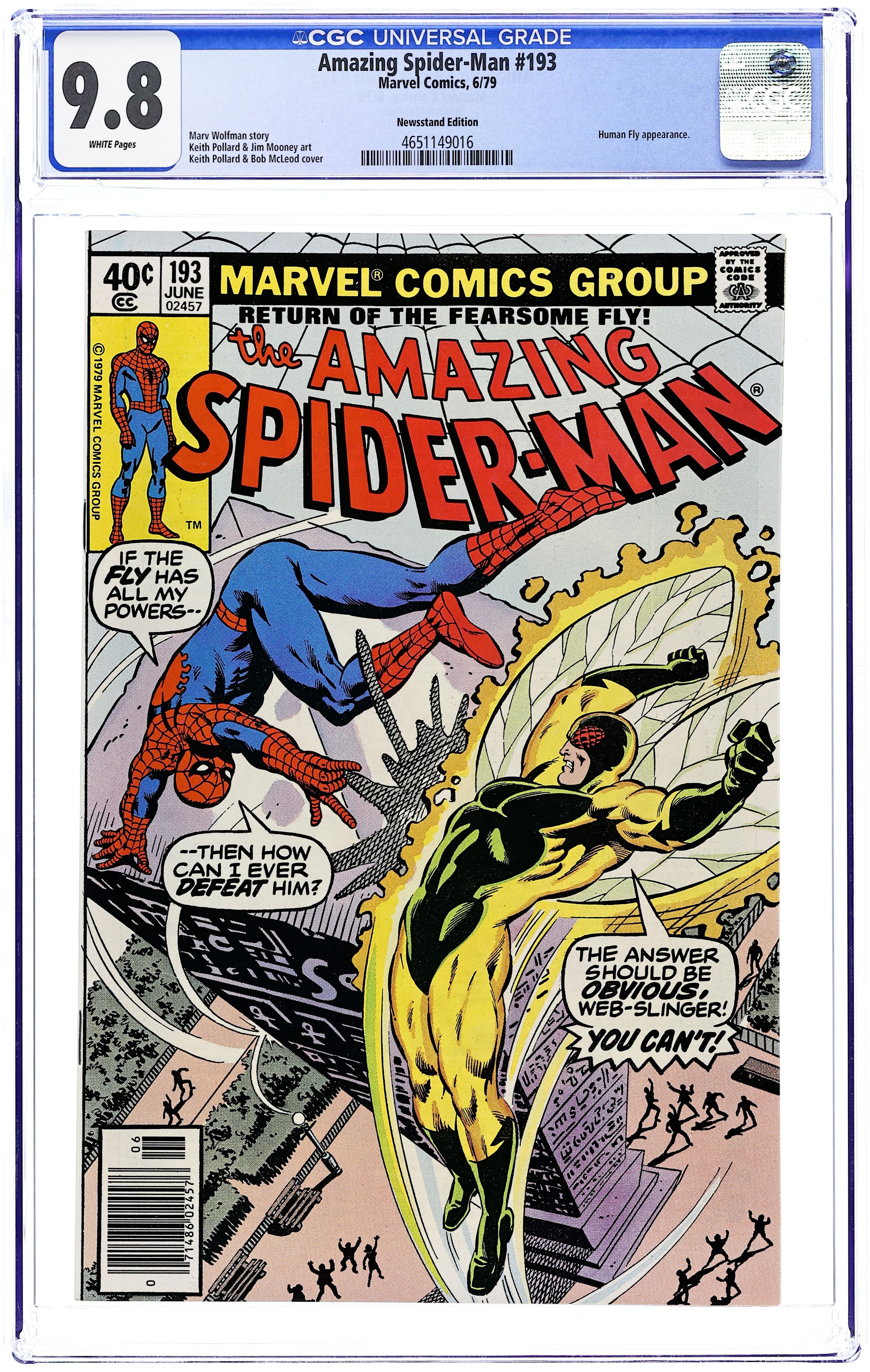 Newsstand Edition. "The Wings of the Fearsome Fly!" Script by Marv Wolfman. Art by Keith Pollard (layouts) and Jim Mooney (finishes). Cover by Al Milgrom and Bob McLeod. Peter Parker's life is a train wreck after surviving his recent 24-hour ordeal. In very short order Jonah fires him, Mary Jane dumps him, and Ned Leeds punches him! Oh my, where is a super-villain when Spidey really needs one? Fortunately, there is one flying around town for the web-slinger to vent his frustration upon: the Fearsome Fly! But when the wall-crawler and the Fly collide at Cleopatra's Needle, Spider-Man's day just gets worse. Meanwhile, the original burglar from Amazing Fantasy 15 is back...and still haunting (Aunt) May Parker. Cameo appearances by Mary Jane Watson, Betty Brant, and Mysterio (in civilian clothes). (Notes: The Fly appears next in Spider-Woman 30. The plot briefly crosses over with Fantastic Four 207. Other than a cameo appearance in issue 201, Mary Jane Watson exits the Amazing Spider-Man series for the next 4 years.) 36 pages. Cover price $0.40.