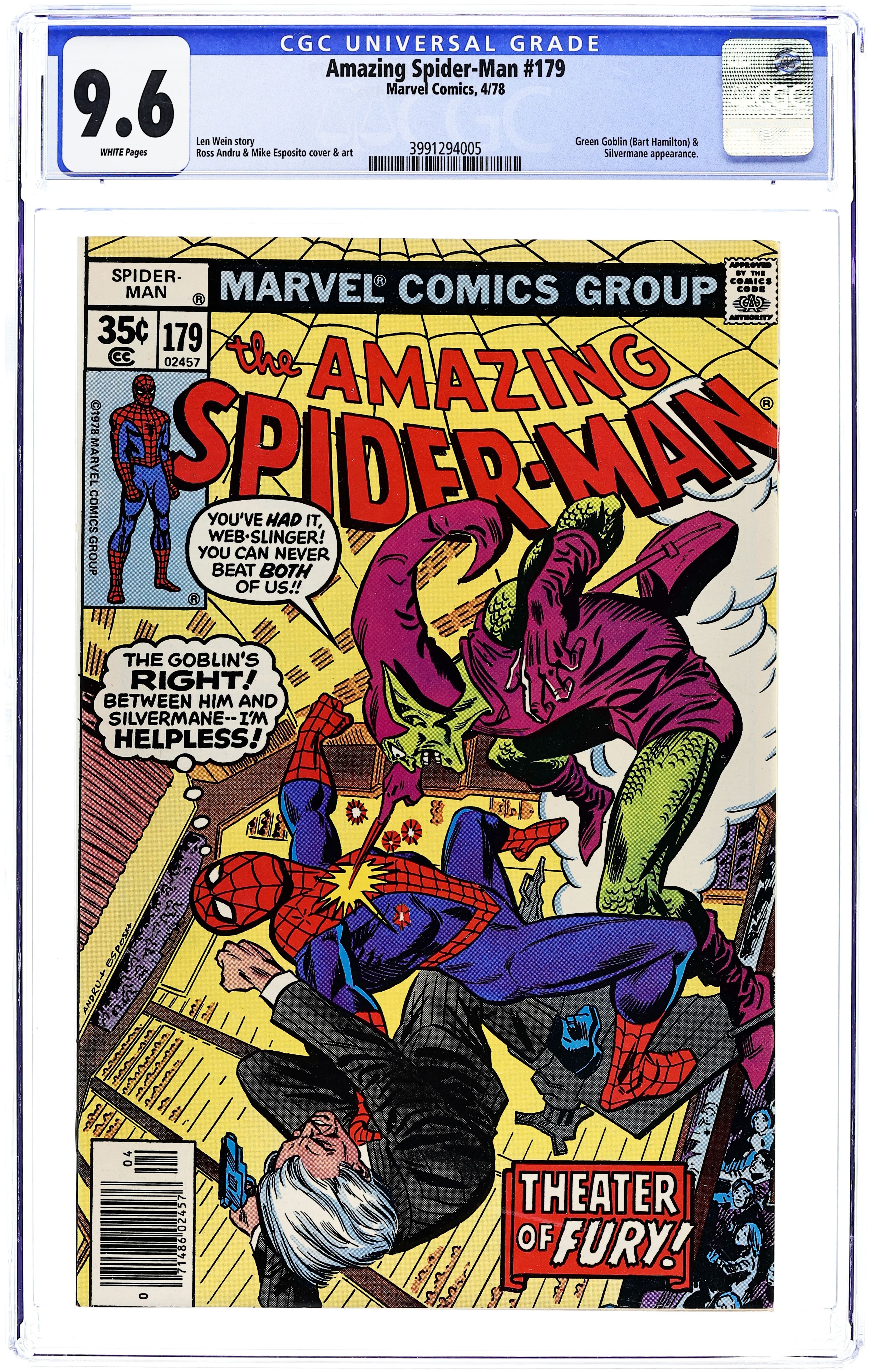 "The Goblin's Always Greener!" Part 4 of 5. Script by Len Wein. Art by Ross Andru (breakdowns) and Mike Esposito (finishes). Cover by Ross Andru and Mike Esposito. In desperate fashion the web-slinger escapes from the Green Goblin's trap and makes a beeline for New Hope Hospital! Once inside Peter finally signs the consent forms to begin his aunt's surgery! While May's heart operation takes place, Joe Robertson tells Peter about a major disturbance going on at Radio City Music Hall. When the wall-crawler arrives at the Showplace of the Nation, the three-way battle erupts: the Green Goblin vs. Silvermane vs. the Amazing Spider-Man! And the winner will be determined next issue! Cameo appearances by Mary Jane Watson, Anna Watson, and Harry Osborn. 36 pages. Cover price $0.35.