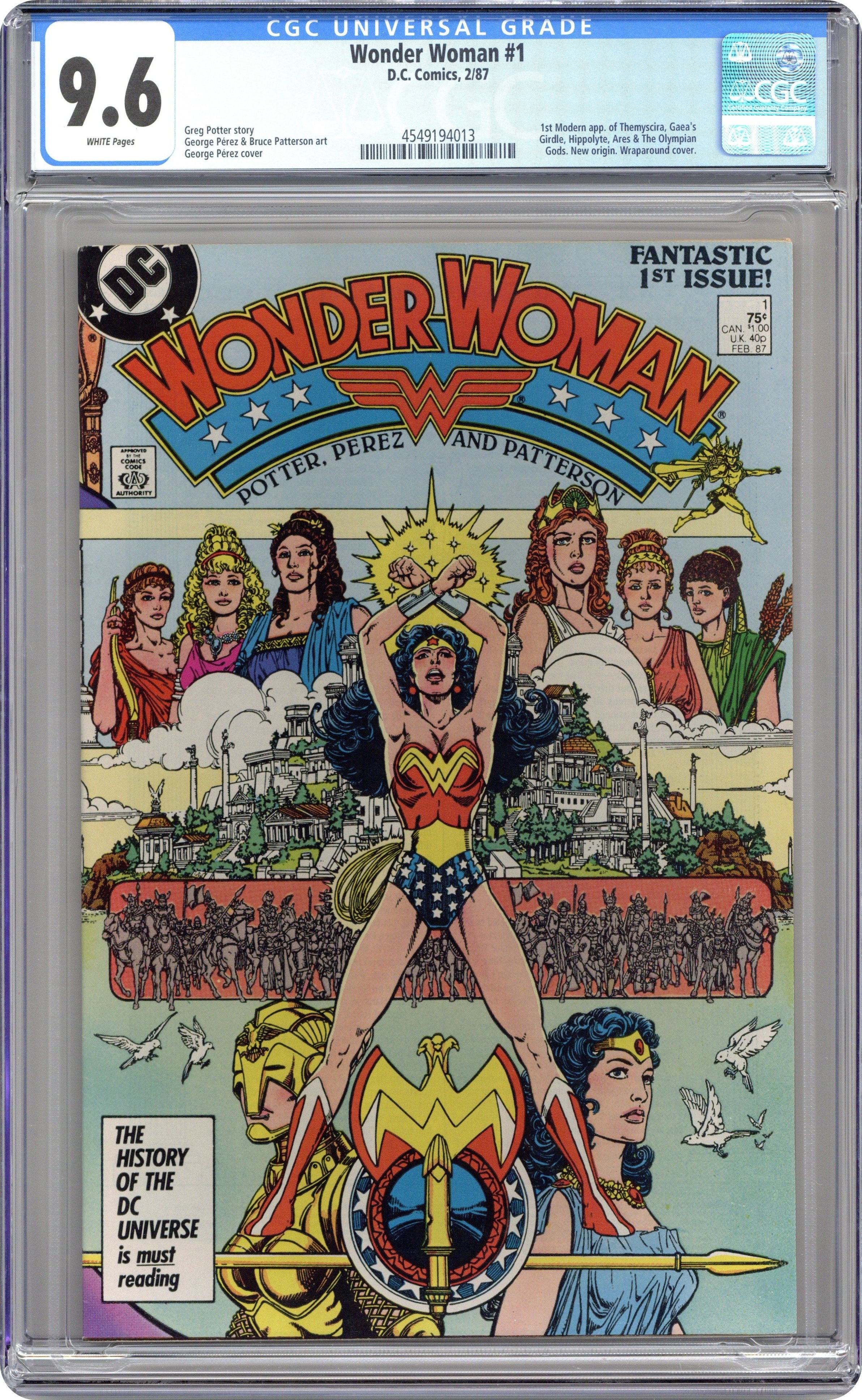 Starts Jan 3 Direct Edition. In this post-Crisis on Infinite Earths re-imagining of the Wonder Woman mythos, Diana is born of clay, growing on Paradise Island to become the champion of the Amazons. "The Princess and the Power!" Part 1 of 6, continued next issue. Script by Greg Potter, co-plot and pencils by George Perez, inks by Bruce Patterson. Perez inks first 2 pages and the final page. Wrap-around cover. No ads. Perez cover. 36 pgs. Cover price $0.75.