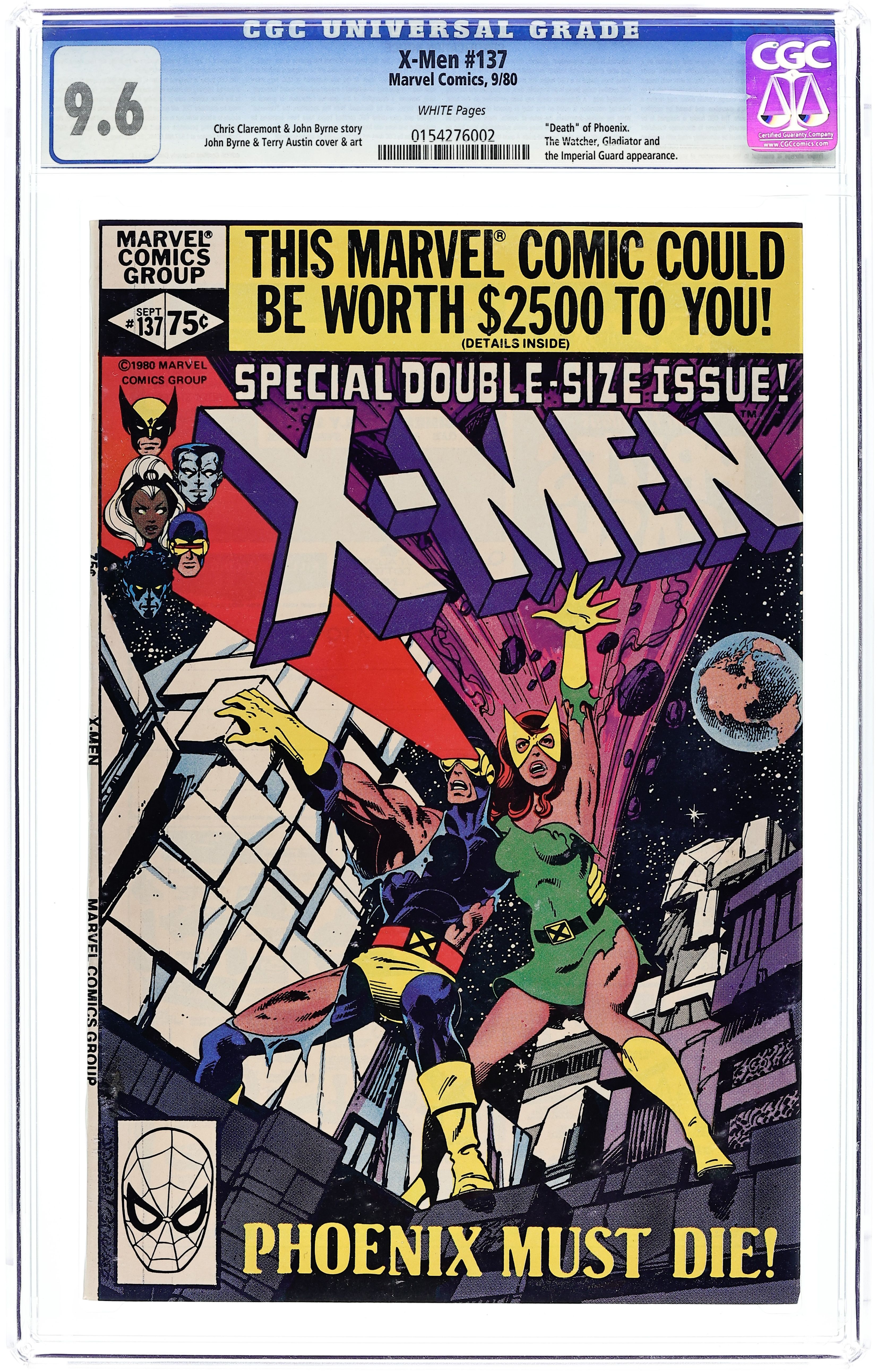 Direct Edition. The Dark Phoenix Saga: Part 9 of 9 - "The Fate of Phoenix!" Guest-starring the Watcher. Story by Chris Claremont and John Byrne. Art by John Byrne and Terry Austin. The persona of the Dark Phoenix has subsided, but for how long? The Shi'ar Empire doesn't plan to wait and find out. While as Dark Phoenix, Jean murdered untold billions, and the alien empire plans to see her pay for her crimes. Now, the X-Men must battle the Shi'ar Imperial Guard in a dual to decide the fate of Jean Grey. Don't miss the stunning conclusion to the greatest X-Men saga of all time!