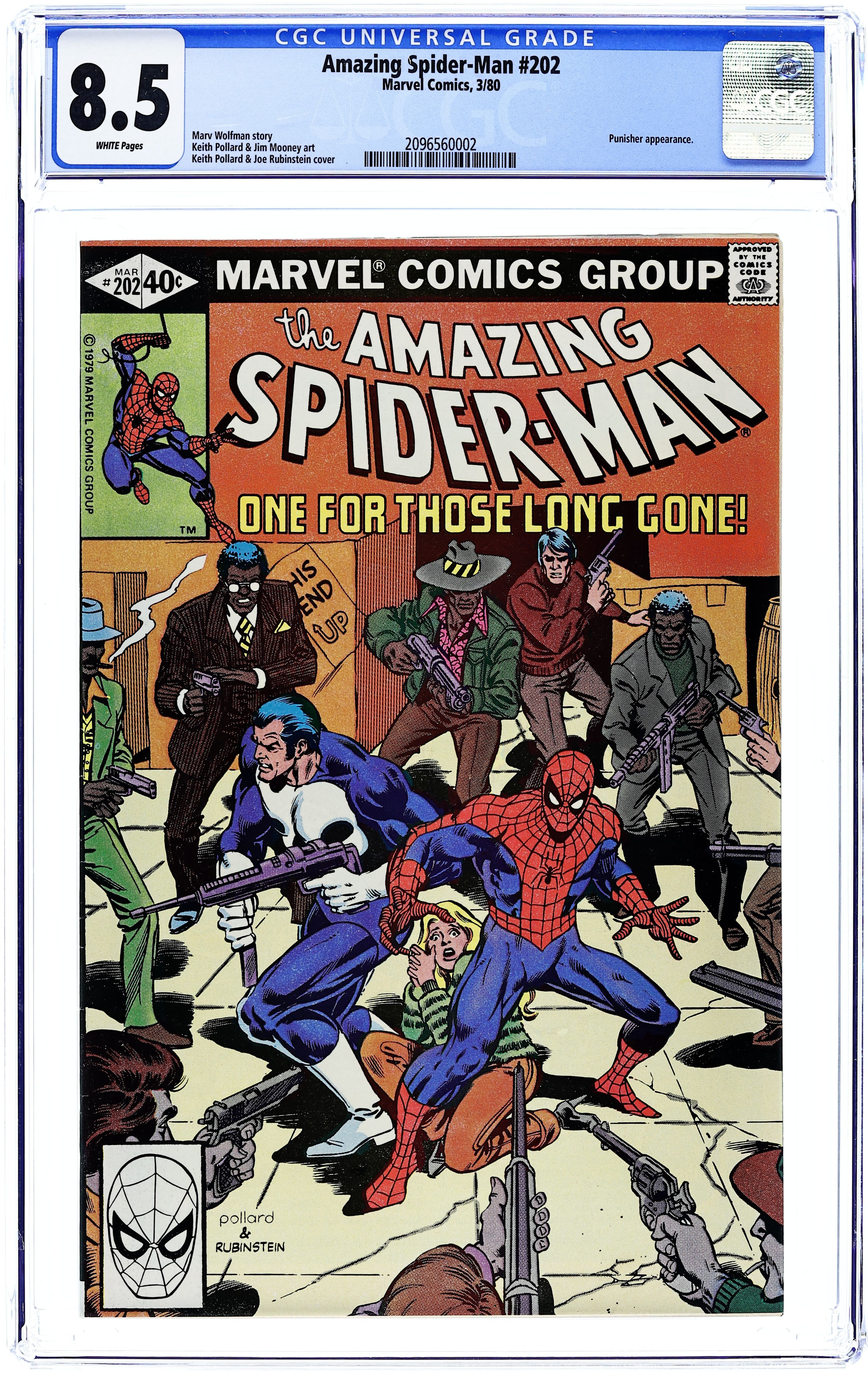 Starts Feb 9 Direct Edition. "One for Those Long Gone!" Part 2 of 2. Guest-starring the Punisher. Script by Marv Wolfman. Art by Keith Pollard (breakdowns) and Jim Mooney (finishes). Cover by Keith Pollard and Joe Rubinstein. After surviving his nervous encounter with the Punisher, Peter Parker slips on his red and blue costume and joins the gun-toting vigilante's pursuit of the drug lords! Spider-Man wants to capture them. The Punisher wants to kill them. Something has got to give! Will the superhero or the anti-hero win the battle of wills? Cameo appearances by J. Jonah Jameson, Joe Robertson, and Dr. Jonas Harrow. (Notes: Spider-Man and the Punisher tangle again in Amazing Spider-Man Annual 15. This issue includes a sideways full-page ad featuring Batroc the Leaper promoting Crazy Magazine. This story was reprinted in Marvel Tales 219.) 36 pages Cover price $0.40.