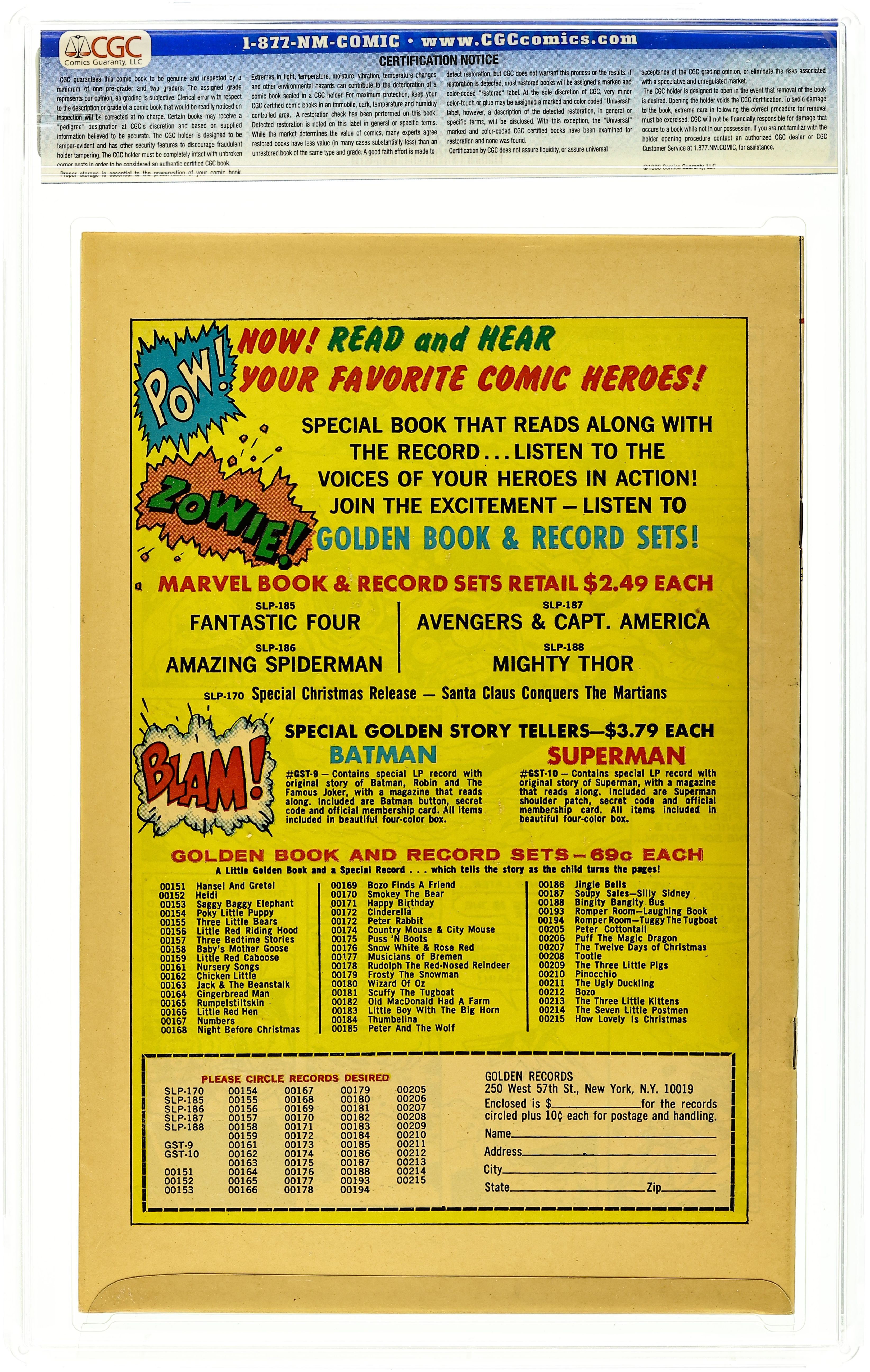 COMIC ONLY, NO RECORD - The Fantastic Four Golden Record Reprint (28-pages, full-color, standard comic format) was produced in 1966 and reprints Fantastic Four #1. Although the reprint, at first glance, looks like the original, there are differences. There is no cover price on the reprint, and the back cover, as well as the inside covers, promote the Golden Record LP series of which the Fantastic Four #1 is a part. The four Marvel Golden Record LPs came with a reprint comic, and each originally sold for $2.49 (record and comic together). In addition to the Fantastic Four LP, there were records produced for Thor (Journey into Mystery #83), Avengers #4; and Amazing Spider-Man #1, all with their own reprint comic. We bought these sets when they first appeared and can still remember following the story in the comic reprint while the record played and the narrator read the story to us. Just to make sure we didn't lose our place, he would say "Turn page," each time he finished the last panel on a page.
