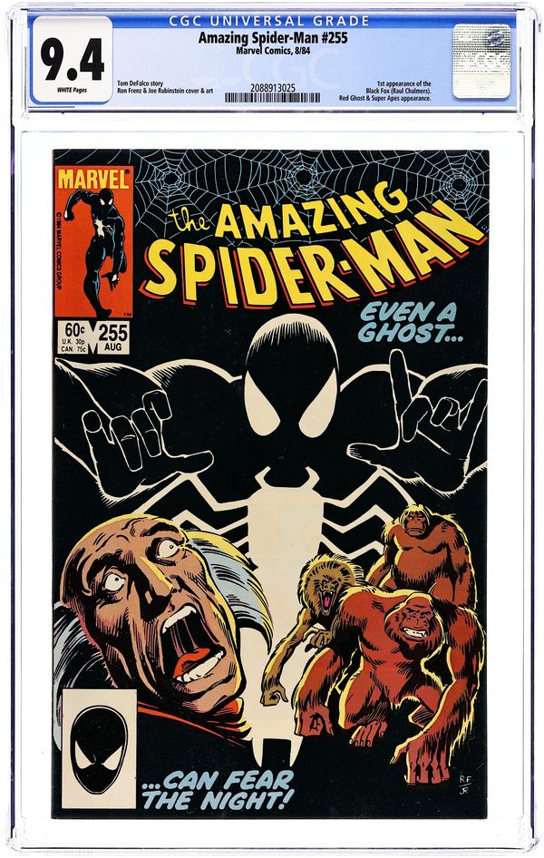 Direct Edition. "Even a Ghost Can Fear the Night!" Script by Tom DeFalco. Pencils by Ron Frenz. Inks by Joe Rubinstein. Cover by Ron Frenz and Joe Rubinstein. The international jewel thief extraordinaire known as the Black Fox breaks into an upscale Manhattan apartment! But regrettably for the aging burglar, the residents of the apartment are none other than the Red Ghost and his Super Apes! After capturing the would-be thief, the Soviet super-villain decides to put the fox to work for himself! When the Black Fox (with the Super Apes in tow) burglarizes a local jewelry store, he encounters another problem...the Amazing Spider-Man! Can Spidey juggle one fox, one ghost, and a trio of apes? Meanwhile, the web-slinger's new black (symbiote) costume begins acting strangely while its wall-crawling host is asleep! First appearance of the Black Fox. Cameo appearance by the Hobgoblin. Flashback cameos by the Fantastic Four, Iron Man, and Jack O'Lantern. (Notes: The Red Ghost returns in Quasar 6. The Black Fox appears again in Amazing Spider-Man 265.) 36 pages. Cover price $0.60.