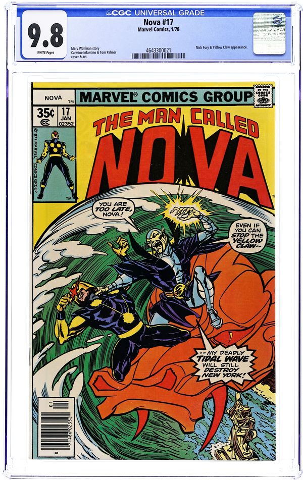 Starts Jan 3 "Tidal Wave!" Guest-starring Nick Fury. Story by Marv Wolfman. Art by Carmine Infantino and Tom Palmer. In the wake of last issues events, Nova and Nick Fury find themselves helplessly bound to a massive warhead hurtling directly toward Washington D.C. Even if they survive and prevent the destruction of our nation's capitol, can the Human Rocket and super-spy possibly stop the super-tsunami created by the nefarious Yellow Claw? Story continues in next issue. 32 pages. Cover price $0.35.