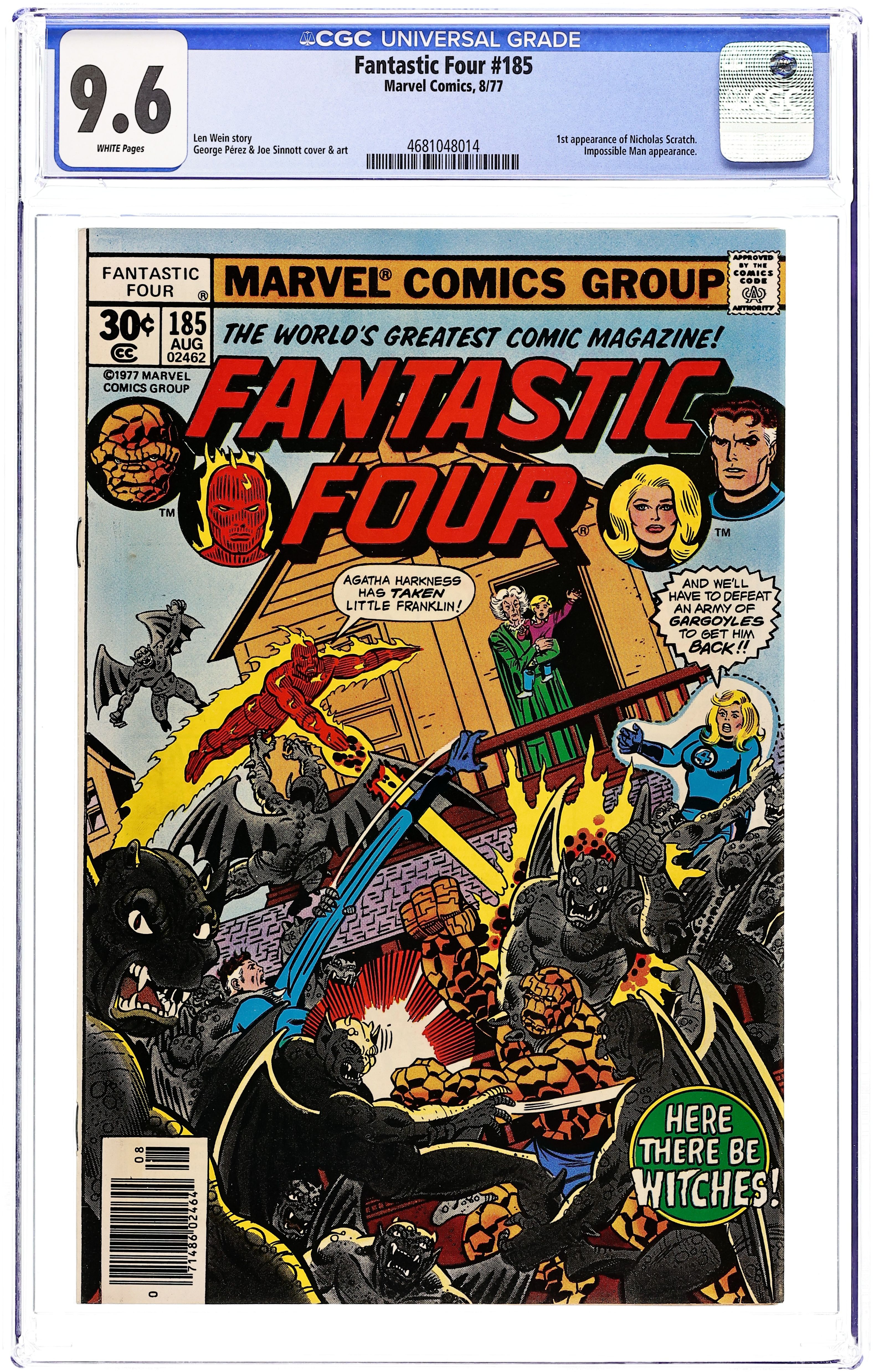 "Here There Be Witches!" Written by Len Wein. Pencils by George Perez. Inks by Joe Sinnott. Cover by George Perez and Joe Sinnott. The Fantastic Four hop in the pogo-plane and fly to New Salem, Colorado in search of young Franklin. The quaint little town of New Salem seems very quiet and peaceful upon the FF's arrival, but appearances can be deceiving! One thing leads to another, and the fabulous foursome find themselves knee deep in gargoyles and witches! Cameo appearance by the Impossible Man. Note: A 35-cent cover price variant exists for this issue. First appearance of Nicholas Scratch. 36 pgs. Cover price $0.30.