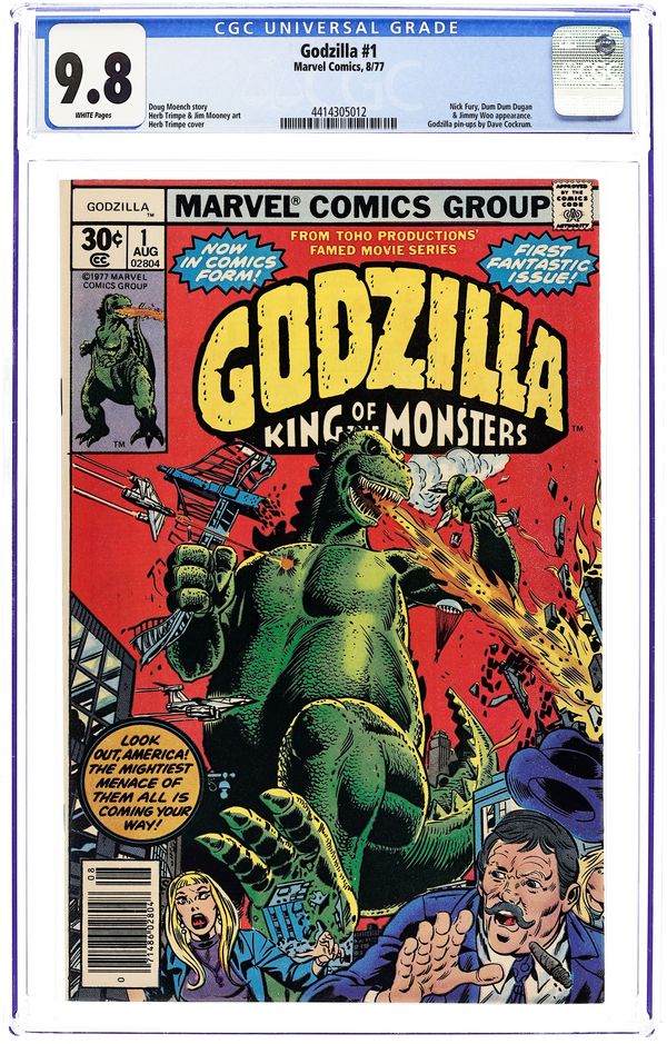 "The Coming!" Guest-starring Nick Fury and S.H.I.E.L.D. Story by Doug Moench. Art by Herb Trimpe and Jim Mooney. The slumbering leviathan known as Godzilla has awaken and rises out of the sea off the shores of Alaska. This reptilian titan has already left Japan devastated and now has made his way to America. With a tail that can smash mountains to dust and fiery breath born out of the Atomic Age, is there anything that can stop this monster's rampage? Right from the Toho Productions' famed movie series comes Godzilla, King of the Monsters. Cover price $0.30.