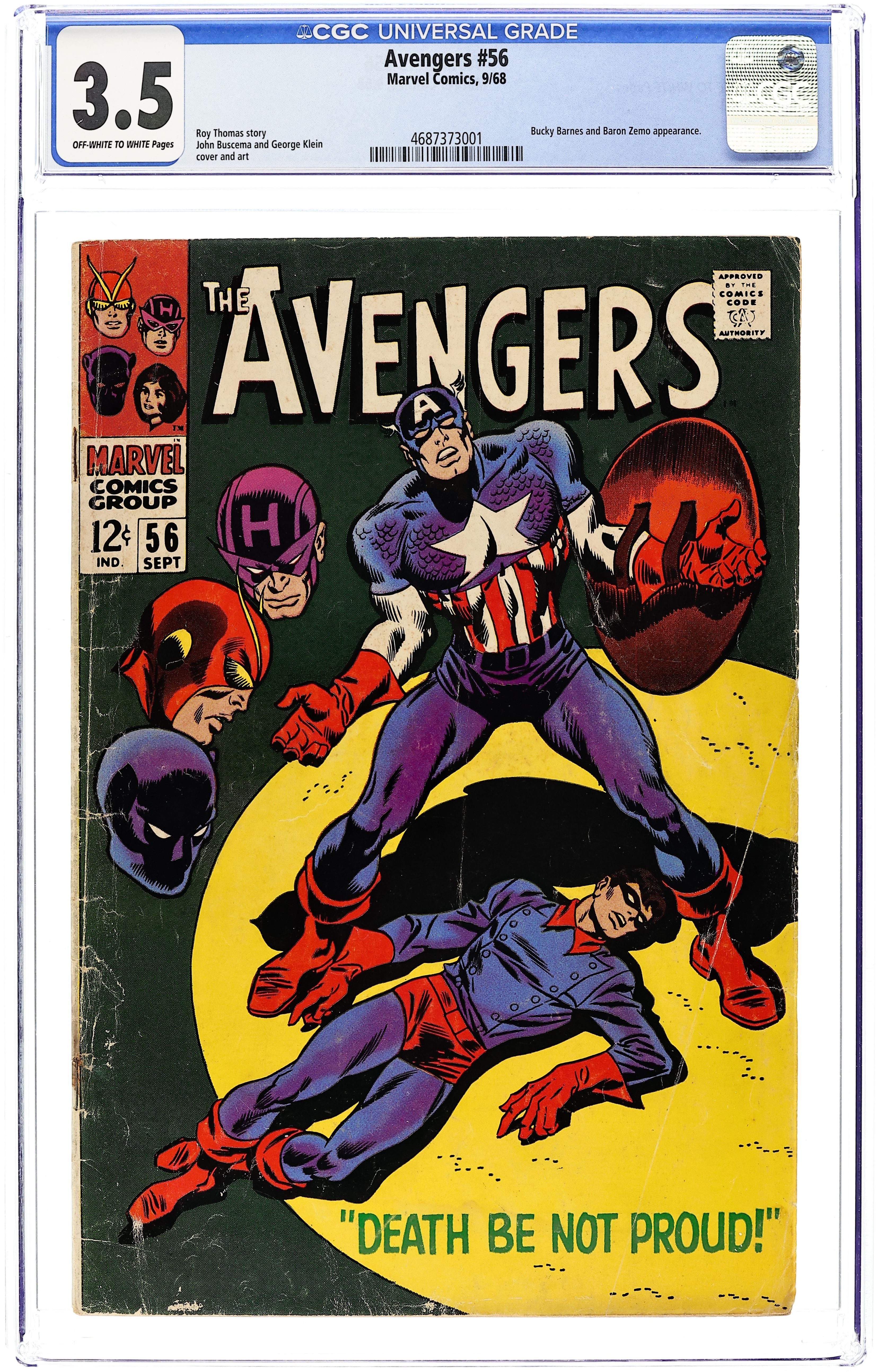 "Death Be Not Proud!" Script by Roy Thomas. Pencils by John Buscema. Inks by George Klein. Cover by John Buscema, George Klein, and Frank Giacoia. In recent days Steve Rogers has been having doubts about the final fate of his WWII partner, Bucky Barnes. Cap is fairly certain that Bucky died while trying to stop Baron Zemo's drone plane, but he's not completely sure. So the Living Legend asks his fellow avengers to meet at Dr. Doom's castle and go back in time with him to 1945! When the Wasp turns the dial on the time platform, the Avengers' journey to World War II-era England begins! Good luck against Baron Zemo! But beware... sometimes the past is best left alone! Story continues in Avengers (1963 1st series) Annual #2. Avengers Lineup: Black Panther, Captain America, Goliath, Hawkeye, and the Wasp. (Notes: The letters page includes a letter from comics historian Peter Sanderson. This issue was reprinted in Marvel Super Action #15.) 32 pages. Cover price $0.12.