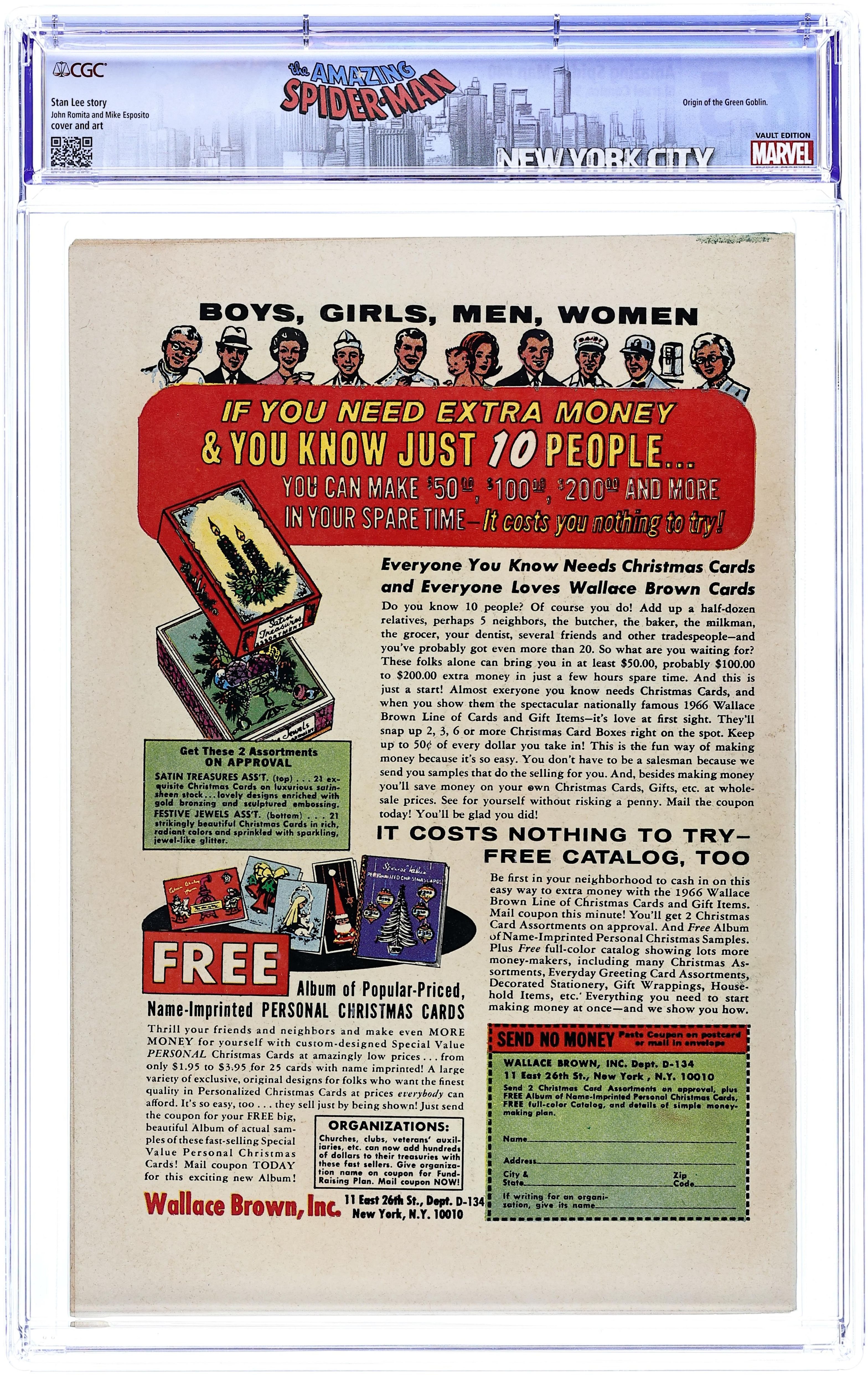 Cover by pencils by John Romita Sr., inks by Mike Esposito and John Romita Sr. (touch-ups). Green Goblin origin in Spidey Saves the Day!. script by Stan Lee, pencils by John Romita Sr., inks by Mike Esposito (as Mickey Demeo) and John Romita Sr. (touch-ups); Spider-Man battles the Green Goblin; While battling, an explosion erases the last several years of Norman Osborn's memory, reverting him to his pre-Green Goblin state. Reprinted in Marvel Tales # 179. 36 pgs., full color. $0.12. Cover price $0.12.