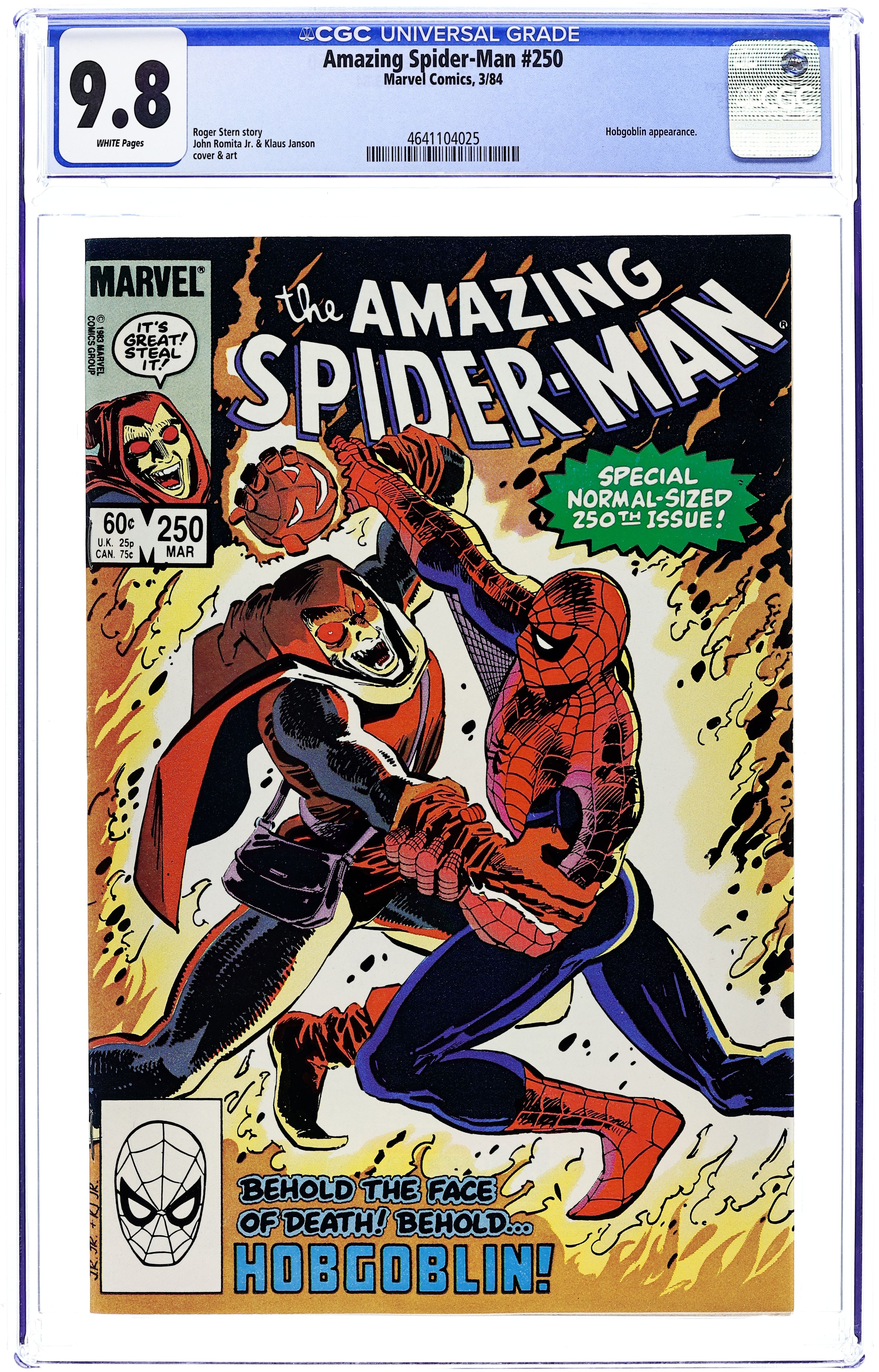 Direct Edition. "Confessions!" Part 2 of 3. Script by Roger Stern. Art by John Romita Jr. (breakdowns) and Klaus Janson (finishes). Cover by John Romita Jr. and Klaus Janson. The web-slinger's one-man war vs. the Hobgoblin continues! The amazing one privately contacts all the businessmen being extorted (by the goblin) in hopes of getting a lead on the super-villain's whereabouts! But eventually Spider-Man locates the Hobgoblin the old-fashioned way...with a spider tracer! In the Big Apple's Warehouse District, the wall-crawler comes face to face with his startled foe! Can the web-slinger score a quick victory and end the menace of the new goblin? Meanwhile, J. Jonah Jameson decides it's time to confess his involvement in the development of the Scorpion. The Daily Bugle's publisher prepares to take his mea culpa...in the pages of his own newspaper. Cameo appearances by Harry Osborn and Roderick Kingsley. Flashback cameo by the Kingpin. (Notes: This issue completes the sensational 2-year Stern-Romita Jr. run on the Amazing Spider-Man title. A magnificent collection of issues featuring the Black Cat, Foolkiller, Juggernaut, Cobra, and the Vulture; and of course, highlighted by the creation of the Hobgoblin.) 36 pgs. Cover price $0.60.