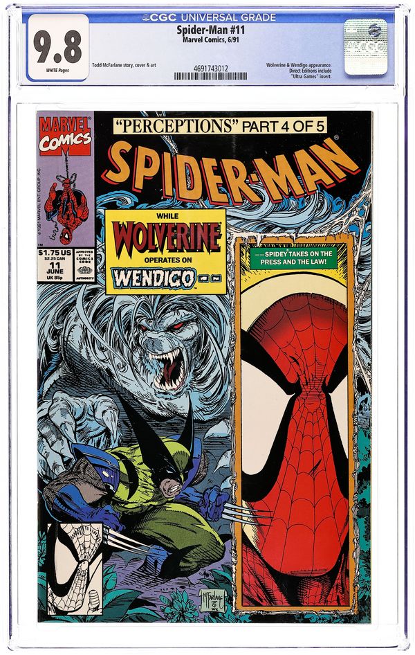 Direct Edition. Perceptions Part 3 of 5. Guest-starring Wolverine. Script and art by Todd McFarlane. Cover by Todd McFarlane. In the middle of the woods, a group of Mounted Police runs into the Wendigo! And as expected the powerful beast savagely tears into the Mounties. But luckily for the RCMP, Wolverine isnearby! And round one between Wolverine and the Wendigo commences! After the furious fight, Logan heads into town and finds an ally: Peter Parker! Later that evening, the wall-crawler and Wolverine meet in the forest to compare notes on the case. Is it possible that the Wendigo is not responsible for the children's deaths? The plot thickens. (Note: Rob Liefeld, Jim Lee, Scott Williams, and Rick Magyar contributed inks to this issue.) 32 pages. Cover price $1.75.
