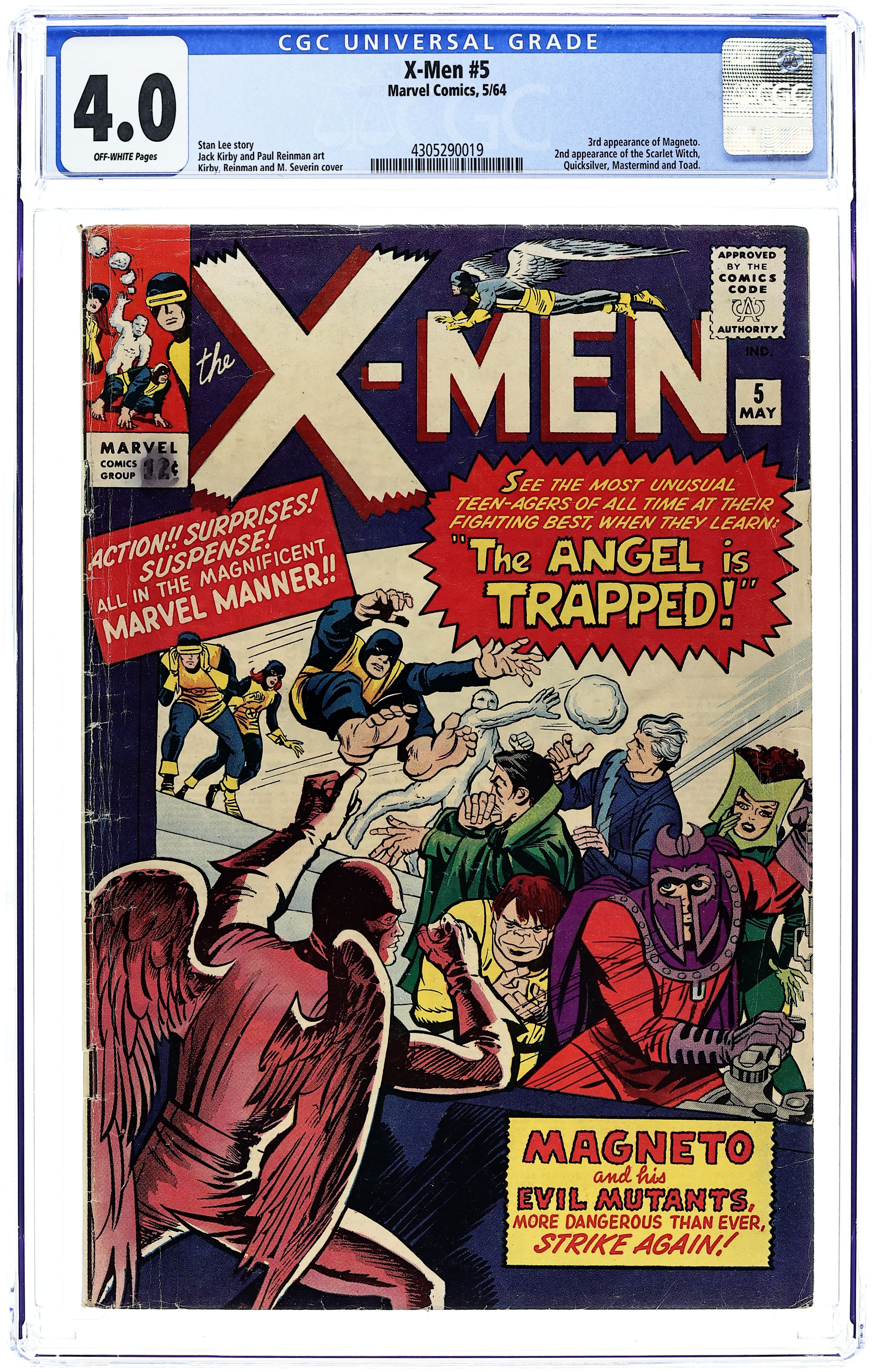 Cover pencils by Jack Kirby, inks by Paul Reinman and Marie Severin (Angel alterations). Trapped: One X-Man!, script by Stan Lee, pencils by Jack Kirby, inks by Paul Reinman; With Xavier's mental powers gone, the X-Men try to decide how they will function without his leadership; Trying to ferret out the X-Men, Magneto has the Toad enter an atheletic event where he leaps to victory; With the crowd turning hostile due to the Toads amazing abilities, the X-Men arrive on the scene to capture him; Magneto snags Angel and whisks him away to Asteroid M; In an attempt to trade the Toad for Angel, the X-Men arrive on Asteroid M where they battle the Brotherhood once again; On their safe return to earth, Xavier revels that his power loss was a ruse to test his students. First Appearance of Magneto's Asteroid M; Prof's loss of powers just a test. Letter column begins in this issue. 36 pgs. $0.12. Cover price $0.12.