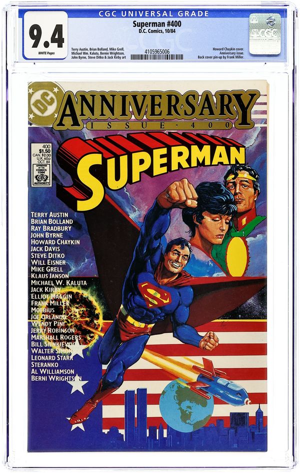 Direct Edition. Giant-Sized 400th Anniversary issue! Introduction by Ray Bradbury. How do people look at Superman? How will we see him in the future, as historians and scholars evaluate this figure who so dominated the 20th century? When he is no longer with us...who will we think he was? Come into the future with us to find out and explore..."The Living Legends of Superman." Script by Elliot Maggin. Art by Joe Orlando (4 pages), Al Williamson (8 pages), Frank Miller (4 pages), Marshall Rogers & Terry Austin (7 pages), Wendy Pini (3 pages), Michael W. Kaluta & Kelly Alder (6 pages), Klaus Janson (10 pages), Jim Steranko (10 pages, and Steranko also handles the script, letters & colors for his sequence). Pin-ups by: Brian Bolland, Jack Kirby & Terry Austin, John Byrne, Jack Davis, Leonard Starr (Superman flying with Annie and Sandy), Walt Simonson, Bernie Wrightson, Will Eisner (Superman and the Spirit), Steve Ditko, Mike Grell, Moebius, Bill Sienkiewicz, Jerry Robinson (Batman, Robin, Joker, Penguin appear in pin-up). Cover by Howard Chaykin. Back cover by Frank Miller. 68 Pages, Full Color. Cover price $1.50.