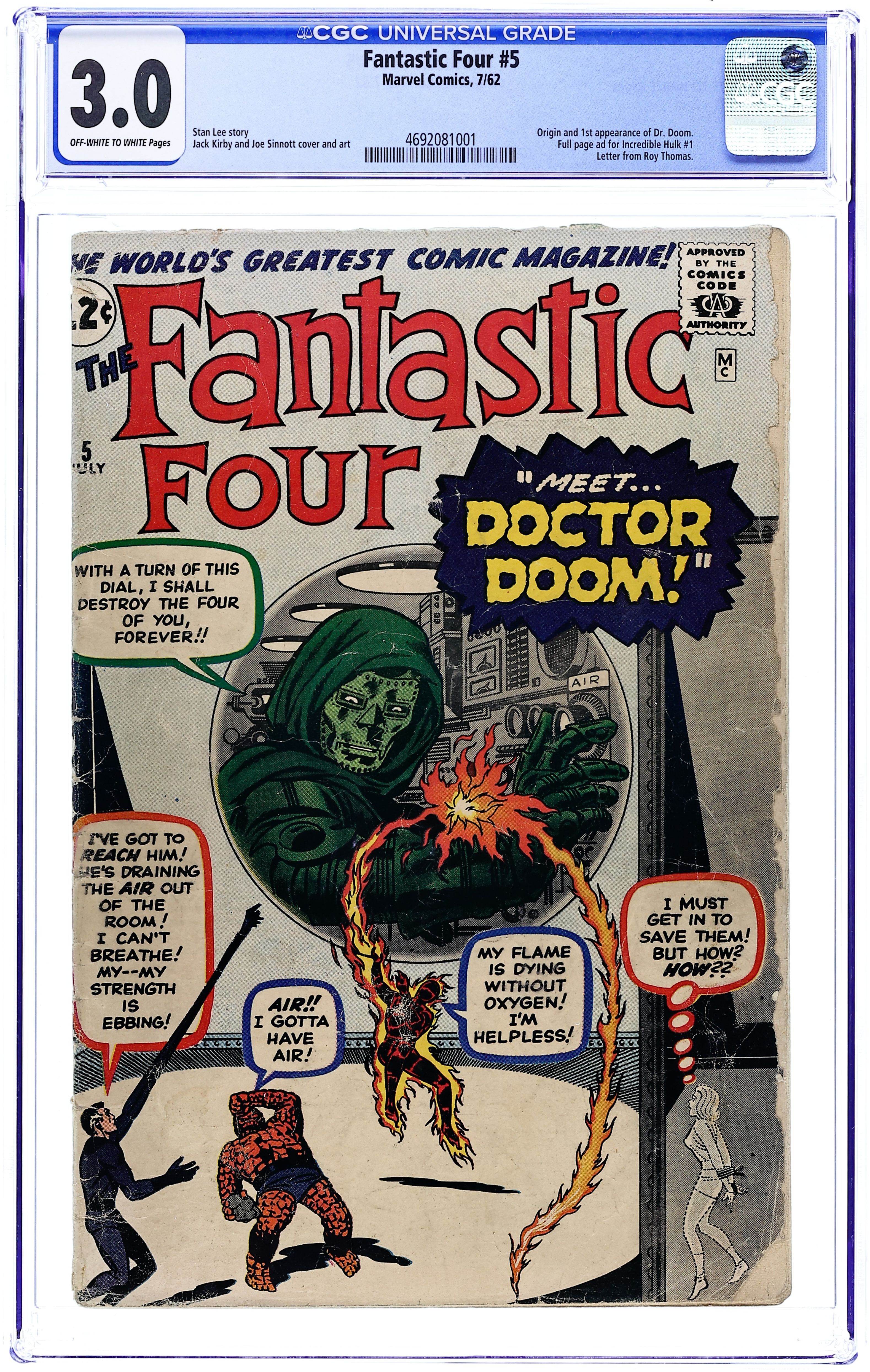 Cover pencils by Jack Kirby, inks by Joe Sinnott. Origin and first appearance of Doctor Doom in "Prisoners of Doctor Doom!" Part 1, script by Stan Lee, pencils by Jack Kirby, inks by Sol Brodsky; Doctor Doom takes the Invisible Girl hostage to insure her teammates' obedience. Part 2 Back to the Past!; Doctor Doom brings the FF to his castle stronghold in the USA; There he sends the Torch, the Thing and Mr. Fantastic back in time to retrieve the pirate Blackbeard's treasure. Part 3 On the Trail of Blackbeard; The Thing takes command of a sailing ship in the era of the pirate Blackbeard. Part 4 Battle; The Thing takes on the role of Blackbeard the Pirate and wishes to remain in the past. Part 5 "The Vengeance of Doctor Doom!"; Doom tries to kill the FF when they return from the past, but Invisible Girl saves them. Doom escapes with his jetpack. Hulk cameo. Letter to the editor from comics writer Roy Thomas. 36 pgs. $0.12. Cover price $0.12.