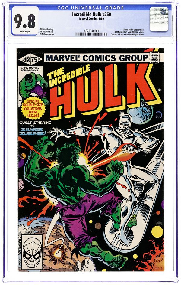 Ends Dec 29 8:33 PM CST Bid History 14 bids Current Bid $73 Your Secret Max Bid If you'd like to bid, please log in or register. Direct Edition. Special giant-sized issue. Guest-starring Silver Surfer. A 250th celebration brought to you by Bill Mantlo and Sal Buscema. The Earth trembles when titans clash. It's the nigh unstoppable Incredible Hulk vs. the former Herald of Galactus, the Silver Surfer. Imprisoned on Earth by his former master, the Silver Surfer intends to add the immeasurable power of the Hulk to his own and break the barrier that keeps him from his home Zenn-La and his beloved. The only problem is, the Hulk has never been known for his generosity. 52 pages. Cover price $0.75.
