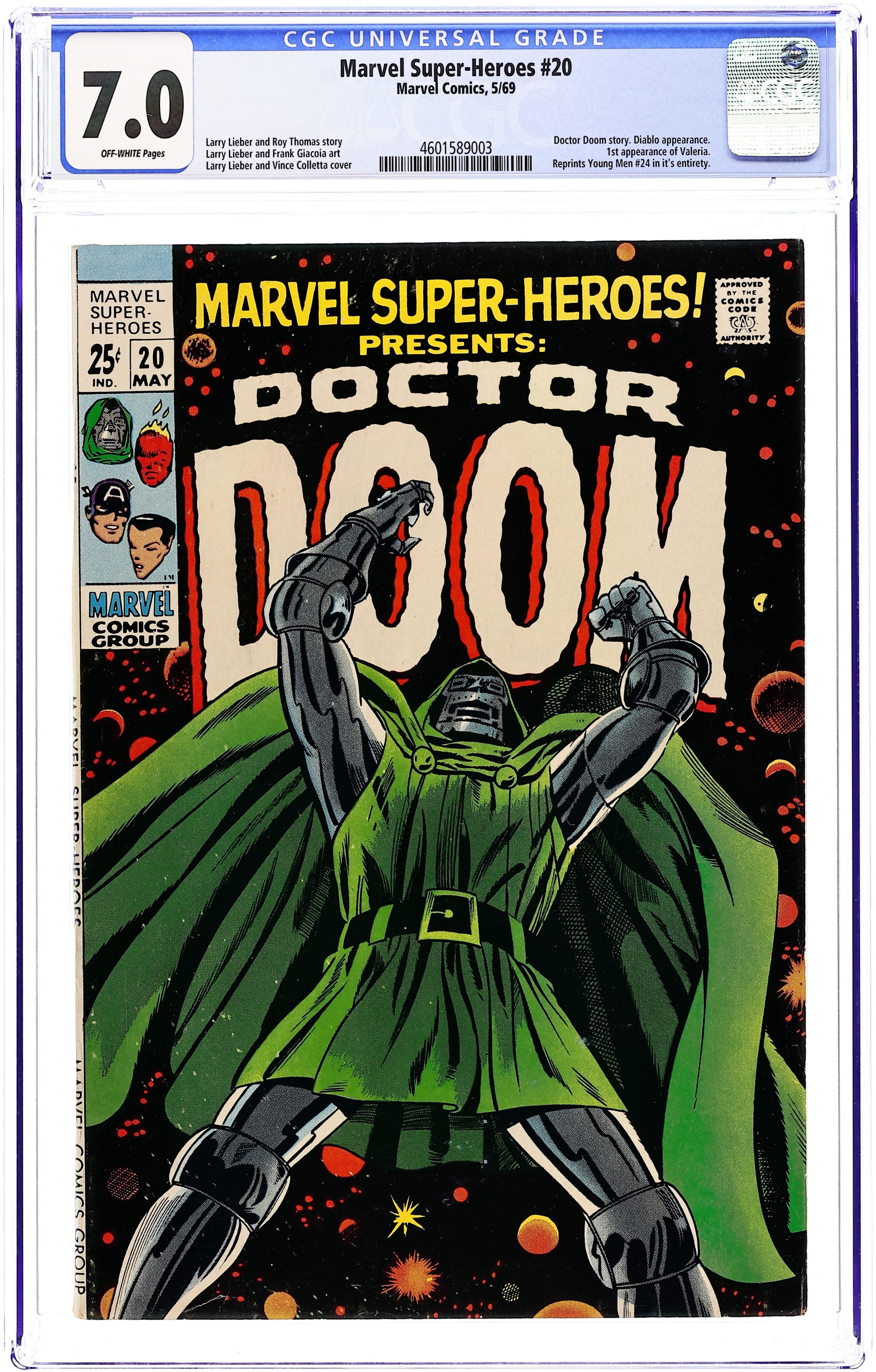 Giant-size issue. Doctor Doom stars in "This Man, This Demon!" Script by Larry Lieber and Roy Thomas, pencils by Lieber and Frank Giacoia, inks by Vince Colletta. Brief Fantastic Four appearance. The remainder of the issue contains Golden Age reprints: the Sub-Mariner by Bill Everett ("The Sub-Mariner Meets a New Enemy...Fire!"); and, from Young Men 24, the Human Torch, Captain America ("Back From the Dead!"), and the Sub-Mariner. This issue also contains a one-page ad for a Starhawk story that never appeared in Marvel Super-Heroes. John Buscema cover pencils. 68 pages, full color. Cover price $0.25.