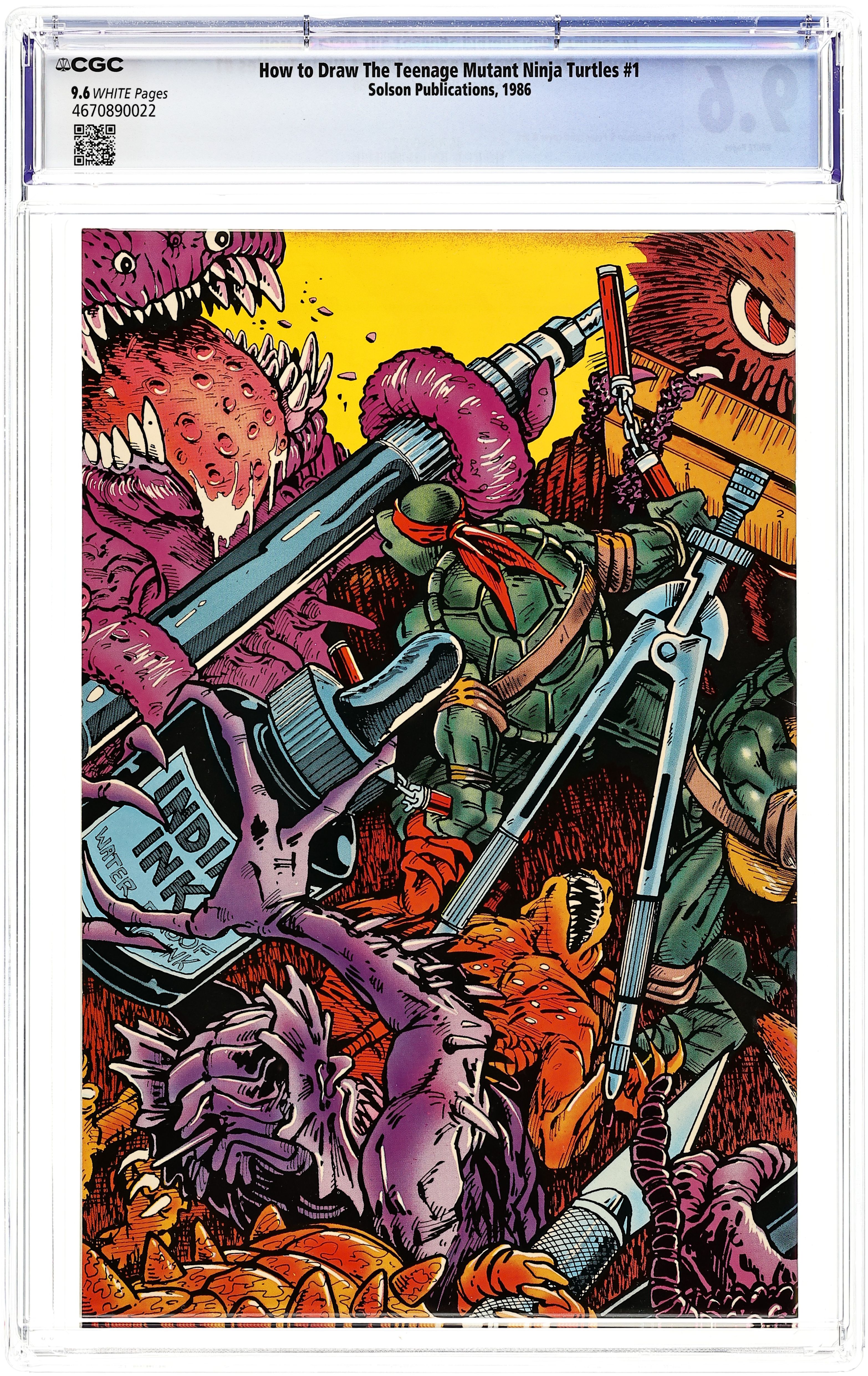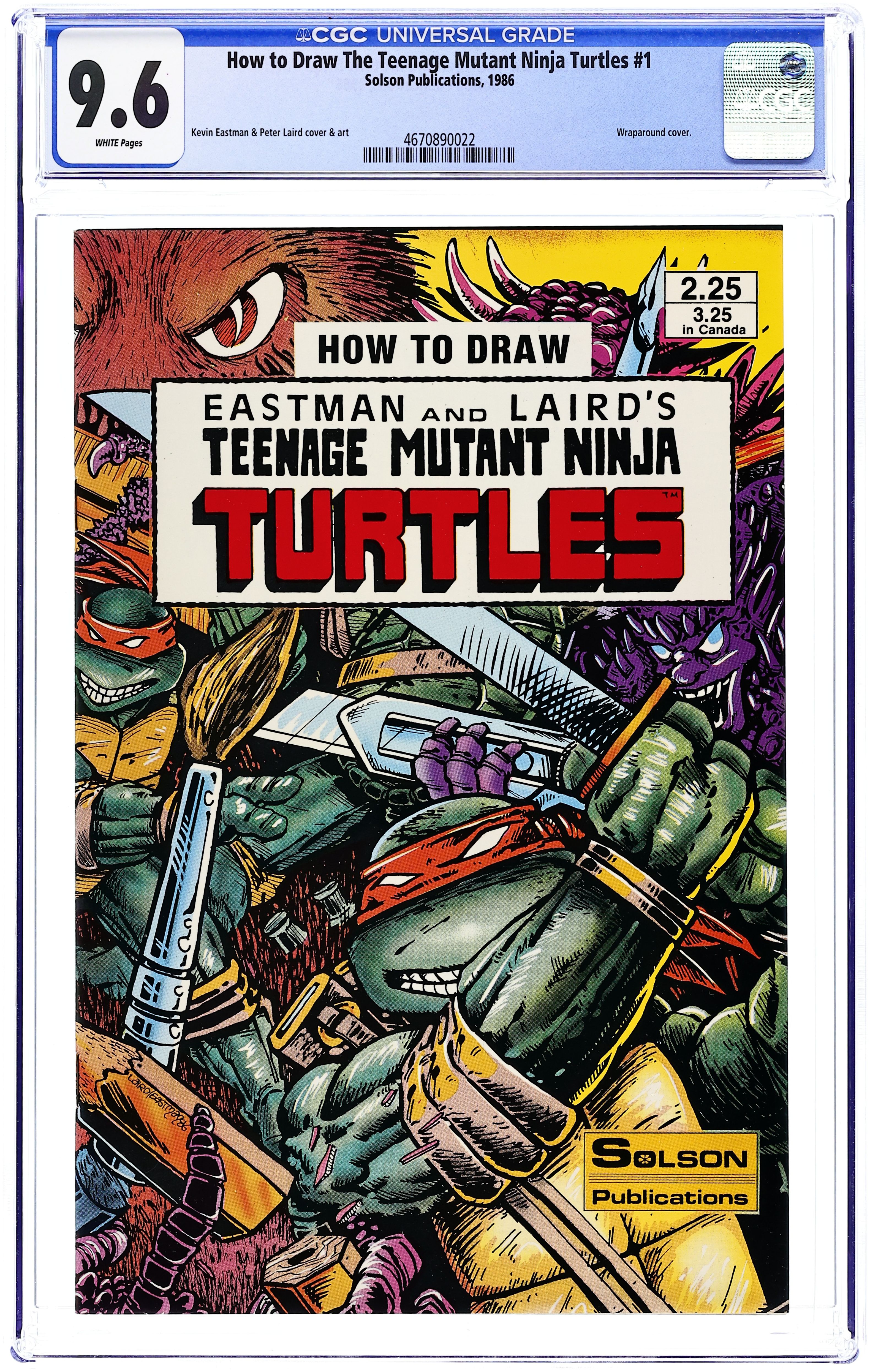 Standard wraparound cover by Kevin Eastman and Peter Laird. Written by Allan J. Fromberg. Art by Kevin Eastman, Peter Laird, and Rich Buckler. One of a series of how-to art books from Solson, the company run by the son of Marvel comics veteran Sol Brodsky. This volume features step-by-step instructions and illustrated examples of how to draw the Teenage Mutant Ninja Turtles, using sketches and pinups drawn by Turtle co-creators Kevin B. Eastman and Peter Laird. Includes weaponry; turtle heads, hands, and feet; action scenes; motion; facial expressions; and even the proper way to draw turtle teeth and shells. Published during the height of the first wave of Turtlemania in comics. 32 pages, B&W. Cover price $2.25.