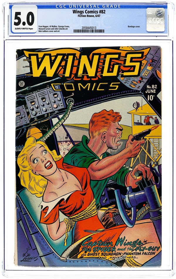 Cover by Bob Lubbers. Edited by J.F. Byrne and William R. Shelton. Stories and art by Bob Lubbers, Charles Sultan, Al Walker, George Evans, John Celardo and Maurice Whitman. Aviation-themed adventure, combat and history tales from pioneering comics publisher Fiction House. Working the advice column, reporter Jane Martin uncovers a blackmail plot and witnesses a murder; Greasemonkey Griffin, on yet another runaway plane, accidentally foils a jewel robbery; Suicide Smith transports tear gas to Central America and gets caught up in a revolution. Good-girl cover with bondage elements by Bob Lubbers. Captain Wings; Jane Martin; Greasemonkey Griffin; Air Heroes of World War II; Phantom Falcon; Suicide Smith; Ghost Squadron. 52 pages, Full Color. Cover price $0.10.