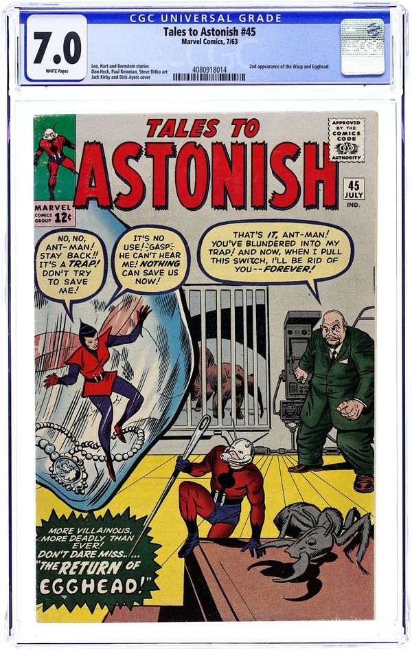 Cover by Jack Kirby and Dick Ayers. The Terrible Traps of Egghead!, script by Stan Lee and Ernie Hart [H. E. Huntley], art by Don Heck; Egghead forms a new gang and sets a trap for the Wasp, hoping to use her against Ant-Man. The Future text story. Bronson's Brain!, script by Stan Lee, art by Steve Ditko; Bronson, an incredible genius upset that no one on earth can match his tremendous intellect, builds a space ship and travels to a planet of highly advanced aliens. It Walks Like a Man!, script by Stan Lee and Robert Bernstein [as R. Berns], art by Paul Reinman; A man is disturbed by his daughter's attachment to her new robot playmate, but changes his mind when it saves her life. 36 pgs., full color. $0.12. Cover price $0.12.