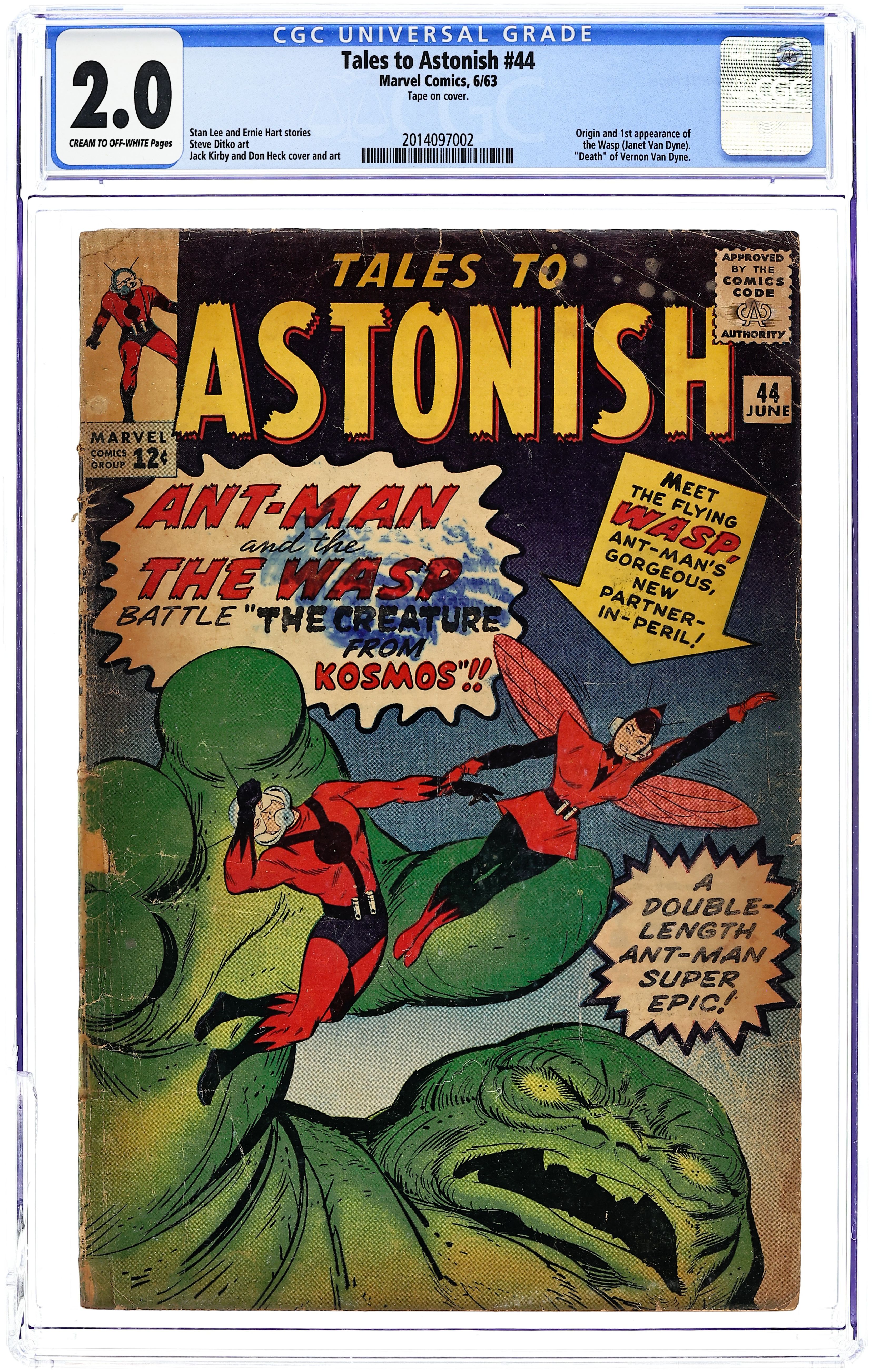 Cover by Jack Kirby and Don Heck. The Creature from Kosmos!, script by Stan Lee and Ernie Hart [H. E. Huntley], art by Jack Kirby and Don Heck; When a fellow scientist is killed by an alien being, Ant-Man enlists the help of the dead man's daughter. Blueprint for Victory text story. Hunted, script by Stan Lee, art by Steve Ditko; In the year 2000 all of New York City is searching for a 'plague carrier' who is attempting to escape notice and flee the city; He is apprehended at a transportation center and the police remove the 'plague' from him which turns out to be a handgun he had stolen from a museum which officials had worried could back bring the plague of war. 36 pgs., full color. $0.12. Cover price $0.12.