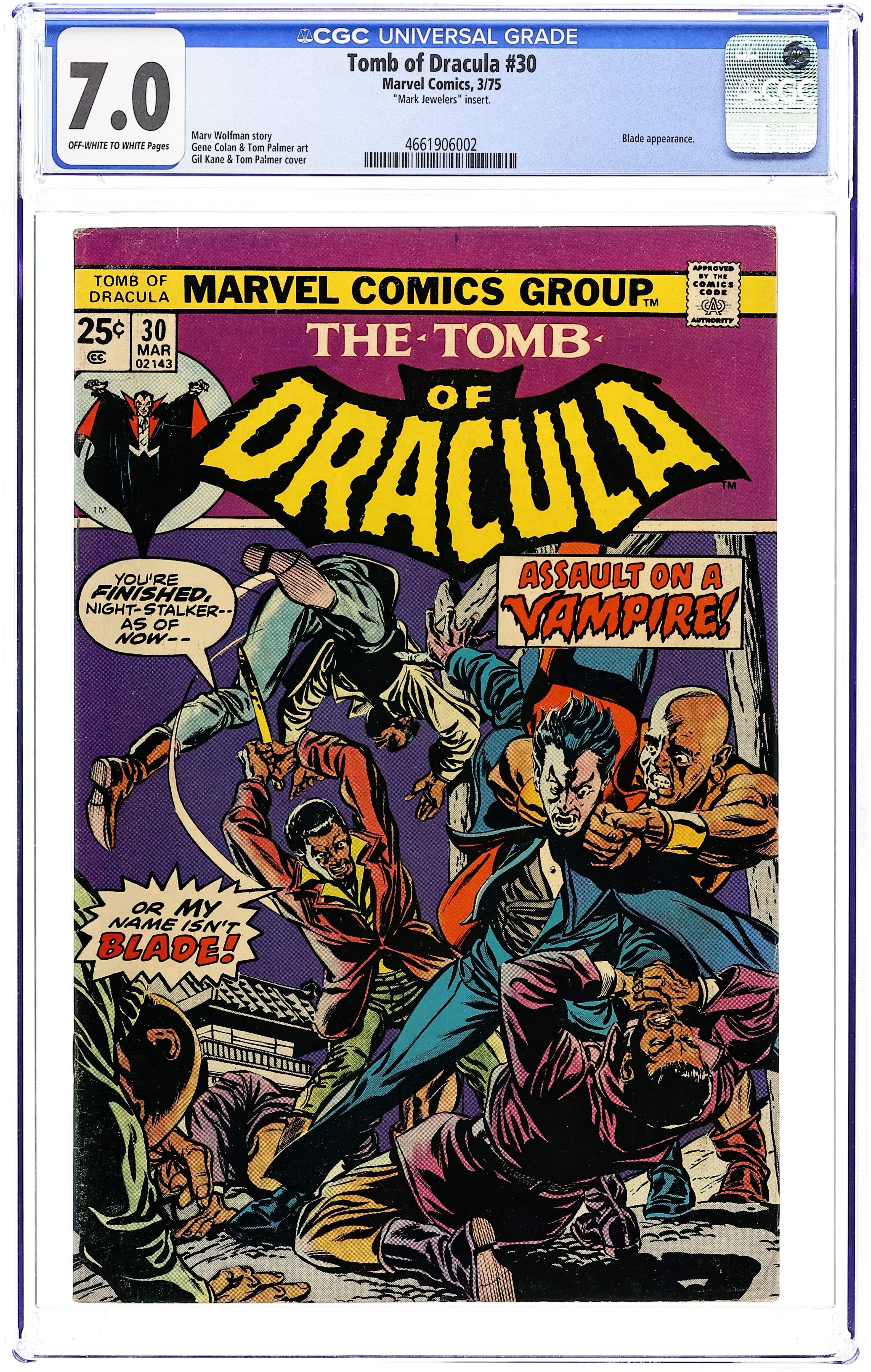 Mark Jewelers Advertisement Insert Variant. Blade guest stars in "Memories on a Mourning's Night!" Script by Marv Wolfman, pencils by Gene Colan, inks by Tom Palmer. Letter to the editor from Dean Mullaney (Eclipse Comics). The letters page also contains Marvel Value Stamp series A # 23 Sgt. Fury. Gil Kane/Palmer cover. Cover price $0.25. Cover price $0.25.