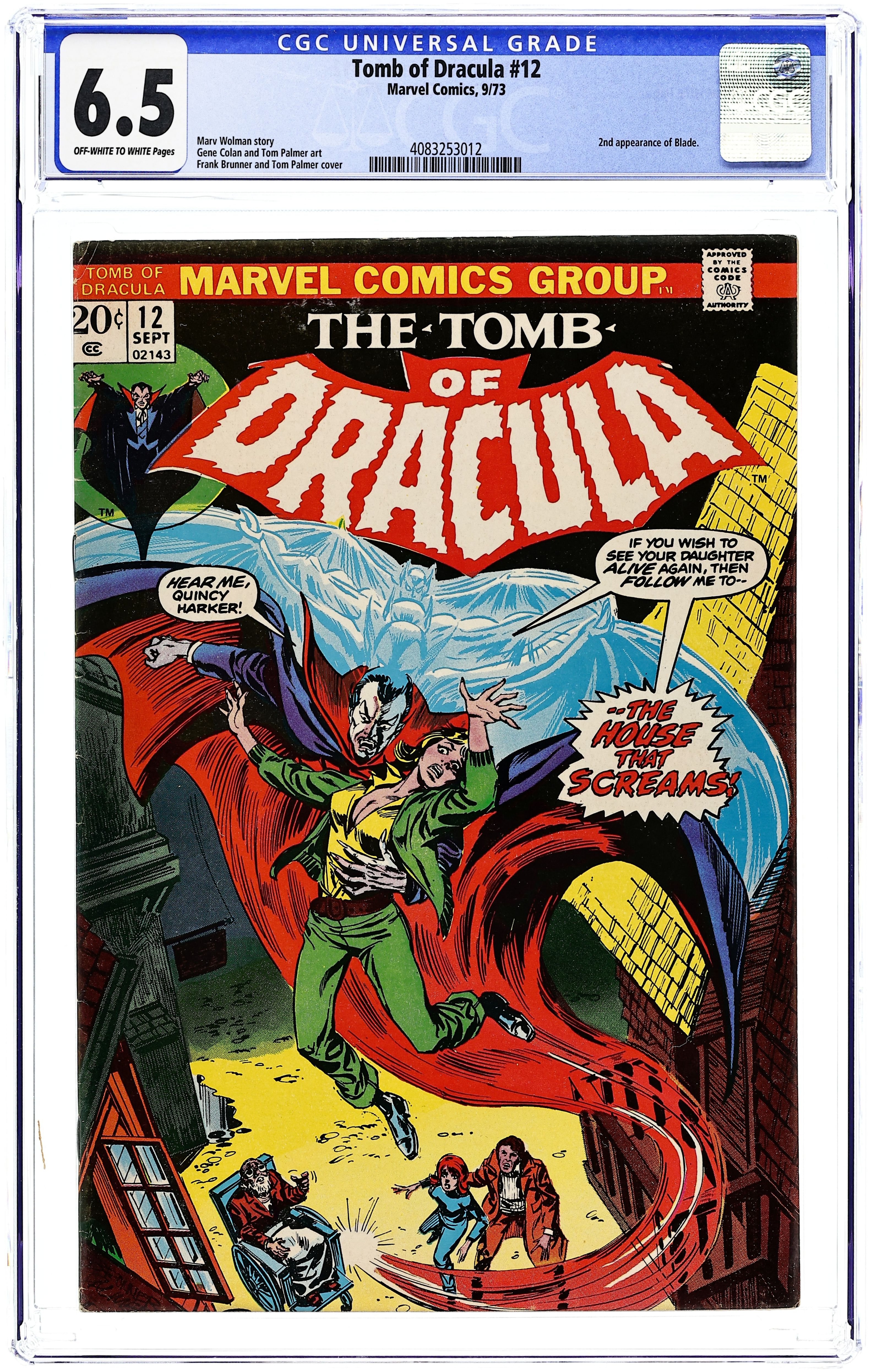 "Night of the Screaming House!" Written by Marv Wolfman. Art by Gene Colan and Tom Palmer. Cover by Frank Brunner and Tom Palmer. Blade returns! But even with the Daywalker's help, Drake, Harker, and the rest of Dracula's enemies are rocked tot heir core when one of their own falls to the curse of the Lord of Vampires! 32 pages, FC. NOTE: This issue marks the beginning of the regular creative team of Wolfman/Colan/Palmer which continues through the end of the series, with issue 70. Cover price $0.20.