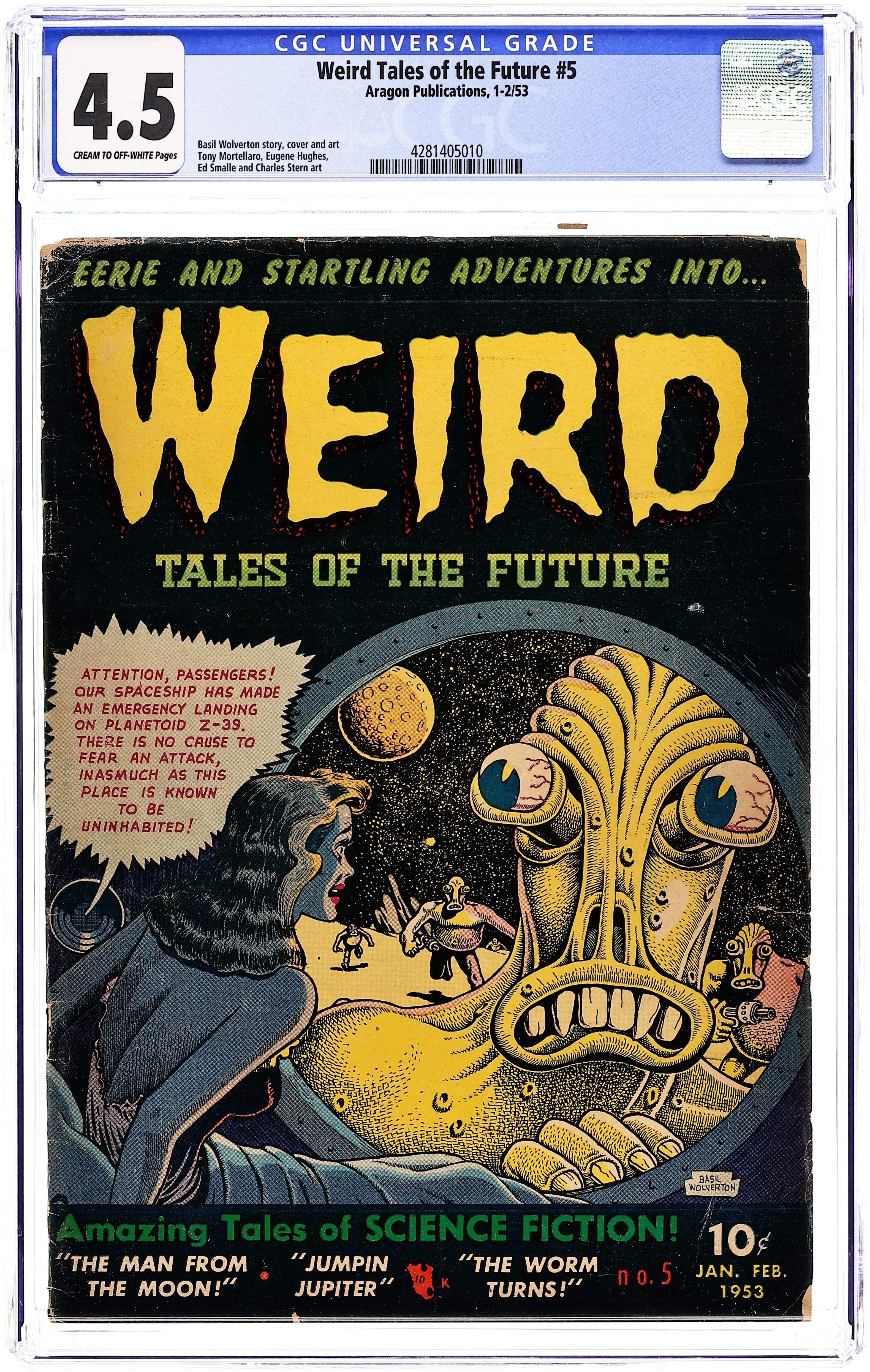 Cover by Basil Wolverton. Stories and art by Tony Mortellaro, Eugene Hughes, Hy Fleishman and Basil Wolverton. Pre-Code tales of science fiction and horror from Stanley Morse Publications. After being abducted by aliens, a man returns to Earth to find civilization destroyed. During a mountain-climbing trip, a man plots revenge against the friend who's sleeping with his wife. A woman decides to free herself from her domineering sister once and for all. Plus an adventure of whimsical spacefaring hero Jumpin' Jupiter. Stories and a classic alien cover by comics legend Basil Wolverton. The Man from the Moon; The Worm Turns; Else Youll Be Dead; Jumpin' Jupiter; Worst Enemy; Under Her Thumb; Torture! 36 pages, Full Color. Cover price $0.10.