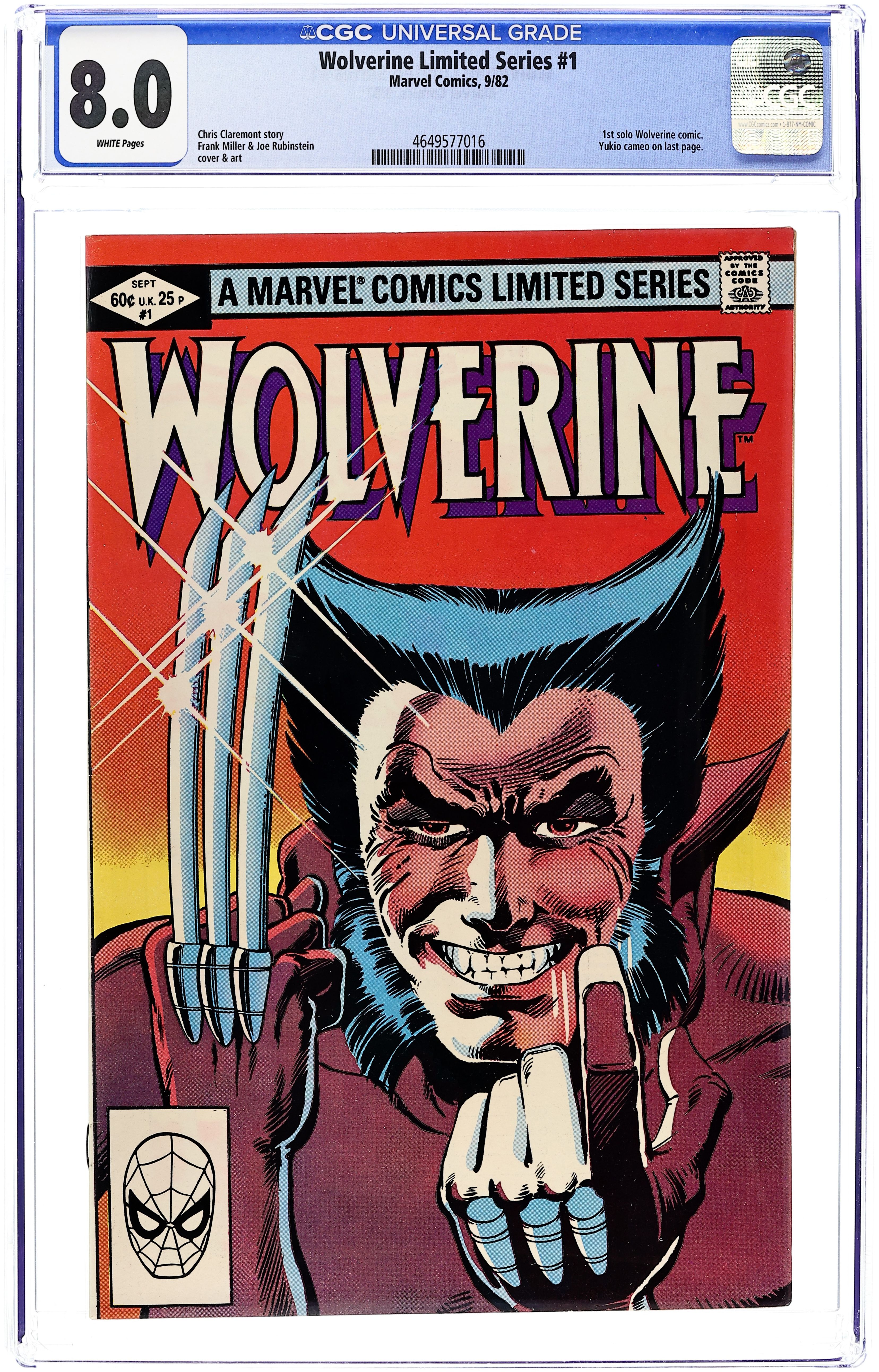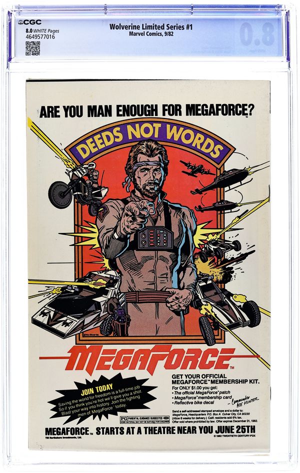 Newsstand Edition. 1 of 4 Featuring Wolverine in his first solo series fighting in Japan. "Wolverine." Script by Chris Claremont, pencils by Frank Miller, inks by Joe Rubinstein. Miller/Rubinstein cover. Back cover MegaForce ad with art by William Stout. Cover price $0.60.