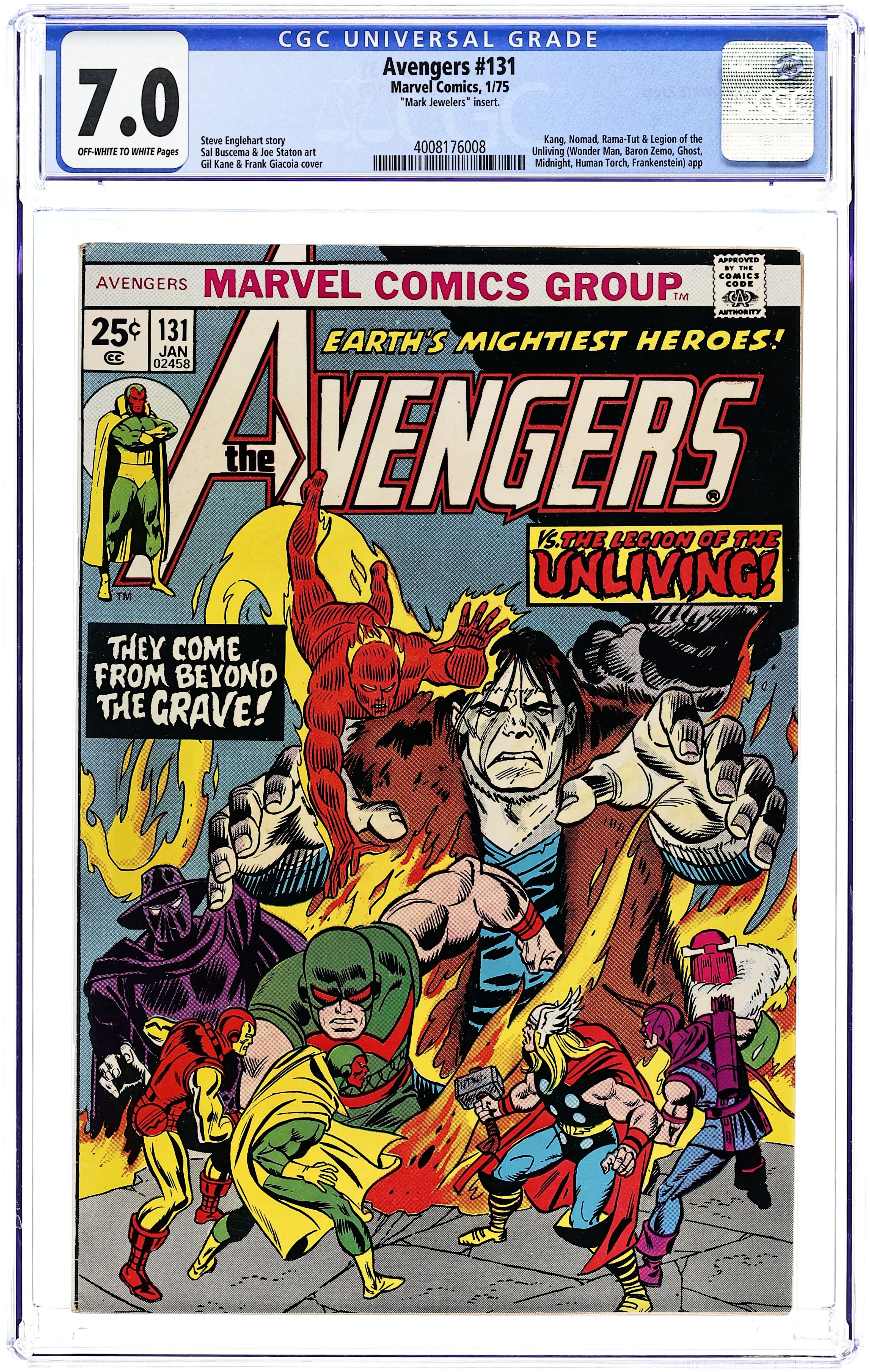 Mark Jeweler Advertisement Insert Variant. The Avengers battle Kang, the Frankenstein Monster, Wonder Man, Baron Zemo, and the Golden Age Human Torch in "A Quiet Half-Hour in Saigon!" Script by Steve Englehart, breakdowns by Sal Buscema, inks by Joe Staton. Avengers roll call: Thor, Iron Man, Mantis, Hawkeye, and the Vision. Letter to the editor from artist Ken Meyer Jr. The letters page also contains Marvel Value Stamp series A # 70 (Super Skrull by Jack Kirby, the same one that's in issue 128). Gil Kane/Frank Giacoia cover. Cover price $0.25.