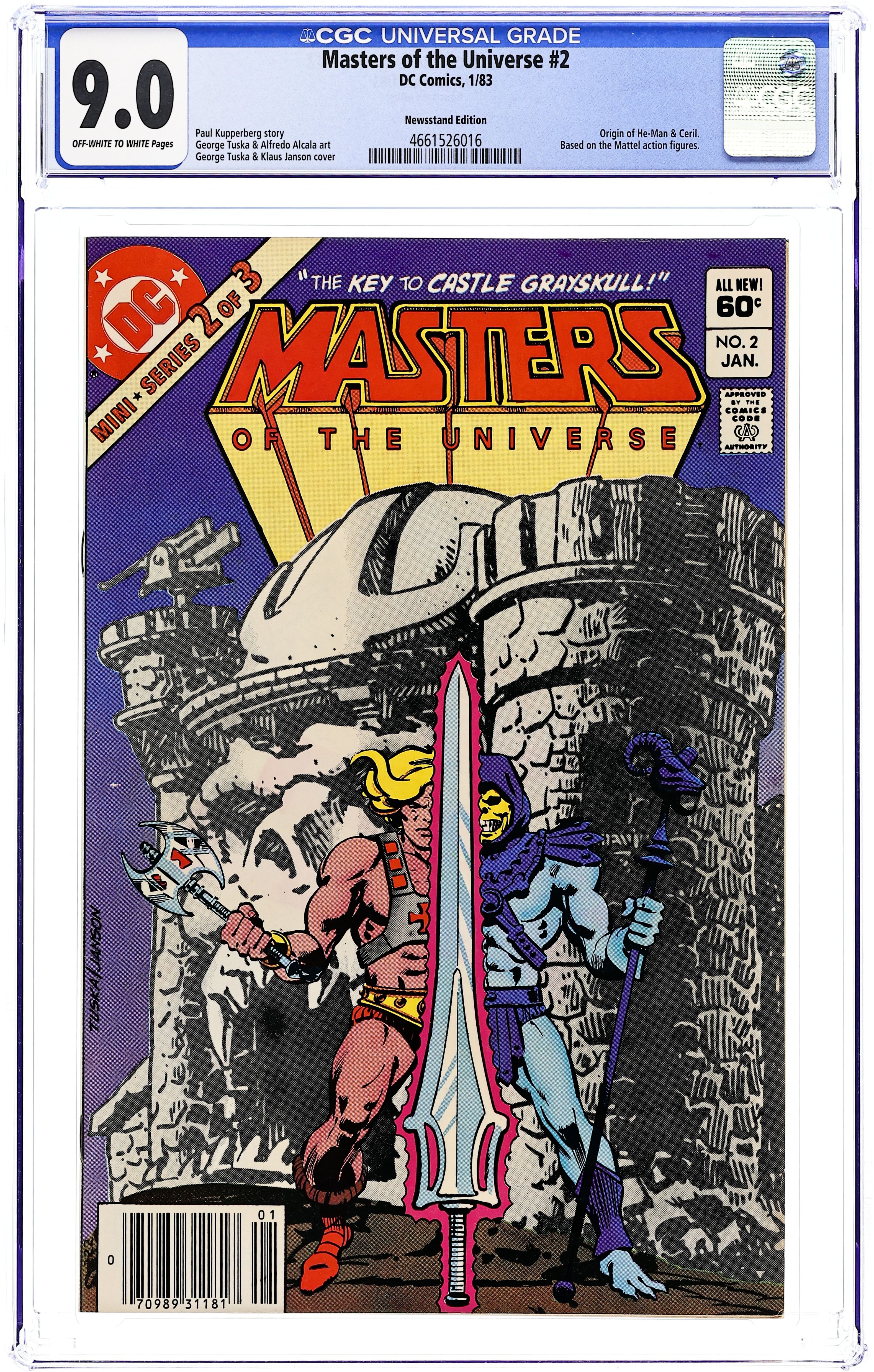 Newsstand Edition. "The Key to Castle Grayskull!' Written by Paul Kupperberg. Art by George Tuska and Alfredo Alcala. Cover by George Tuska and Klaus Janson. The evil warlock Skeletor has taken the beautiful Goddess prisoner. Now, in order to save their friend, He-Man and his mighty companion Battle-Cat find themselves embarking on a harrowing quest at the behest of their most hated enemy. They seek the legendary Power Sword, the most powerful weapon in the universe. But the ancient blade has been split and time is running out. Can our heroes survive the perils of the quest and triumph where so many before have perished? 32 pages, FC. Cover price $0.60.