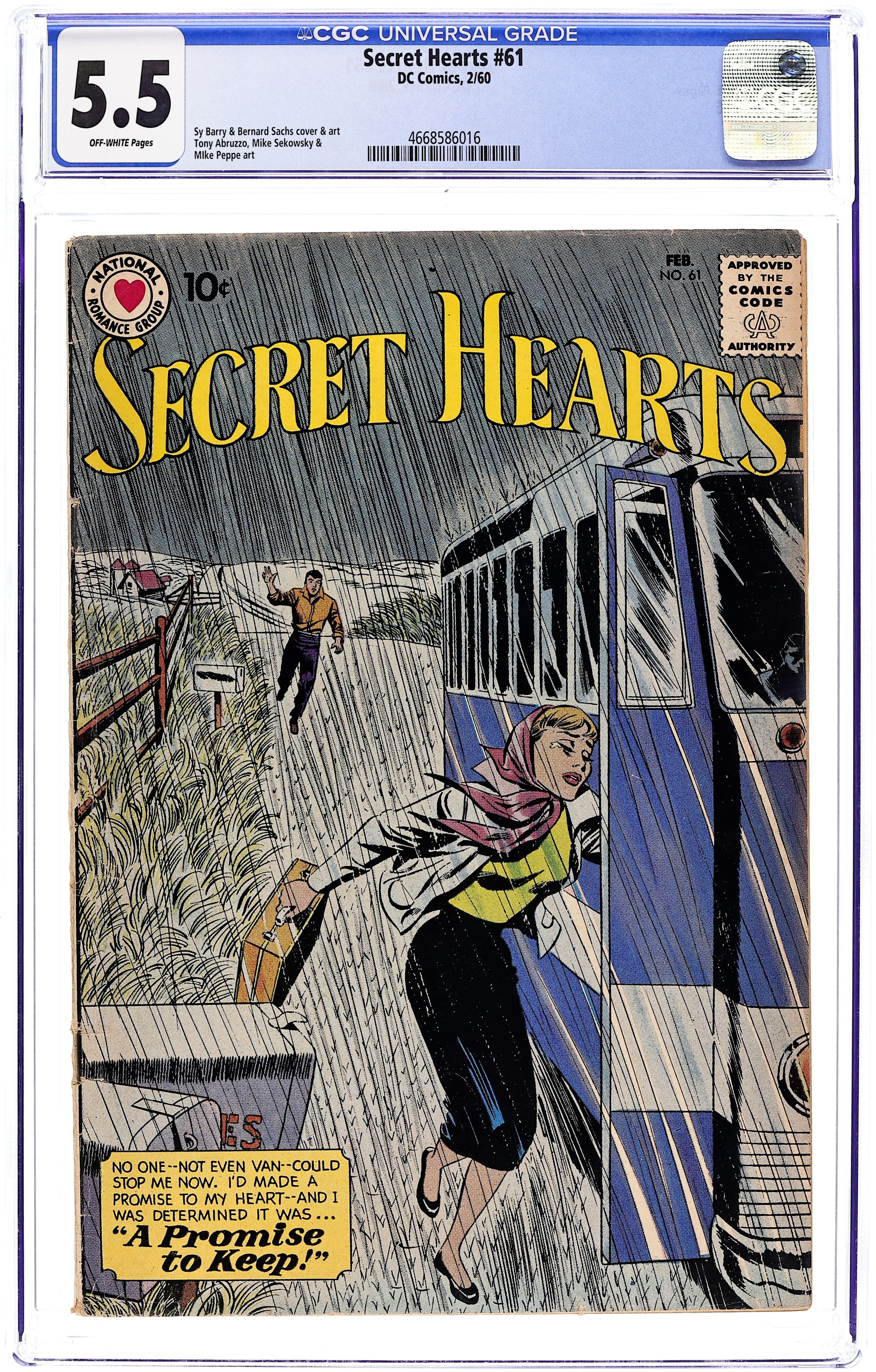 Enchant Me Forever!, pencils by Tony Abruzzo; A man falls in love with a girl he briefly encounters, then tries everything he can think of to find her again. Romance in Fashion filler page. Love Comes Running, pencils by Mike Sekowsky, inks by Mike Peppe; When Emily's old boyfriend Matt returns to her she nearly succumbs to his advances but finally realizes that he doesn't really love her. Mail-Order Romance, art by Bill Draut; When Peggy's pen-pal Dave comes to town to meet her she tries to use him to make her boyfriend Larry jealous. A Promise to Keep, pencils by Sy Barry (pgs. 2-8); Nella has vowed that she will never fall in love again after a boy broke up with her, but she finds it hard to resist Van. Ad for DCs Pat Boone comic. Back cover ad for the DC line of romance comics. 36 pgs. $0.10. Cover price $0.10.