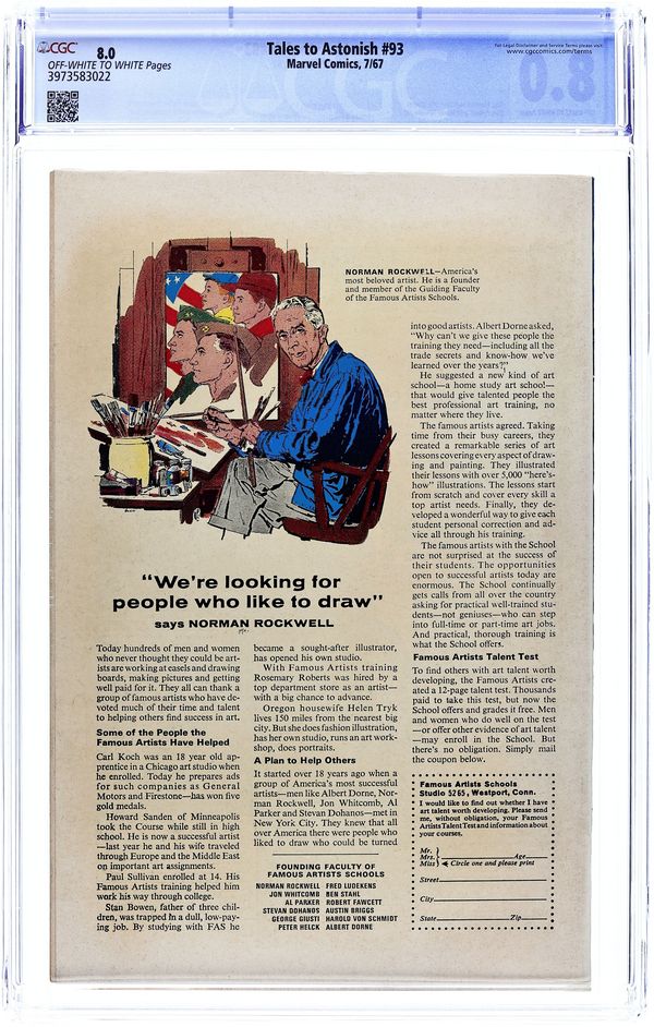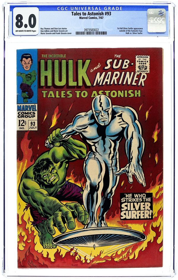 Cover by Marie Severin and Frank Giacoia. The Monarch and the Monster, script by Roy Thomas and Dan Adkins; As Namor battles It, torpedoes from the submarine cause an avalanche, trapping It; Namor turns on the submarine and begins to punch holes in it; It (the creature) returns and they battle, further damaging the submarine and (apparently) killing it;The submarine leaves (with the carcass of It) while Namor breaks off, feeling weakness overwhelm him. He Who Strikes the Silver Surfer, script by Stan Lee, art by Marie Severin; Having 'caught' the Silver Surfer (believing him to be an alien starship), Hulk starts a fight with perhaps the only being on Earth stronger than Hulk is; The Surfer, irritated, knocks him out, then probes Hulk to discover the reason for his belligerence and discovers the damage done by the gamma radiation; Just as the Surfer prepares to reverse the damage and return Dr. Banner's life, Hulk wakes up and, seeing the action as an attack, lashes out. 36 pages, full color. Cover price $0.12.