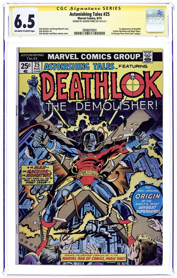 This issue not only marks George Perez's first pro comic art, but the first appearance of Deathlok! Cover pencils by Rich Buckler, inks by Klaus Janson. A Cold Knight's Frenzy, script by Rich Buckler (Plot; Concept) and Doug Moench (Script), pencils by Rich Buckler, inks by Rich Buckler (Primary Inks), Klaus Janson (Ink Assist), Al Milgrom (Ink Assist), and Mike Esposito (Ink Assist); Deathlok is shown to be a robot with a human mind that has the ability to override its programming; Deathlok has a flashback showing that his old army buddy Major Simon Riker is responsible for his creation. Stan Lee's Soapbox, art by Rich Buckler. Creation of Deathlok article, art by Rich Buckler. Promo for Giant-Size Spider-Man #1. Deathlok creation satire, script by Doug Moench, pencils by George Perez, inks by Mike Esposito; George Perez' first published work. Marvel Value Stamp #68 featuring Daimon Hellstrom [Son of Satan]. 36 pgs. $0.25. Cover price $0.25.