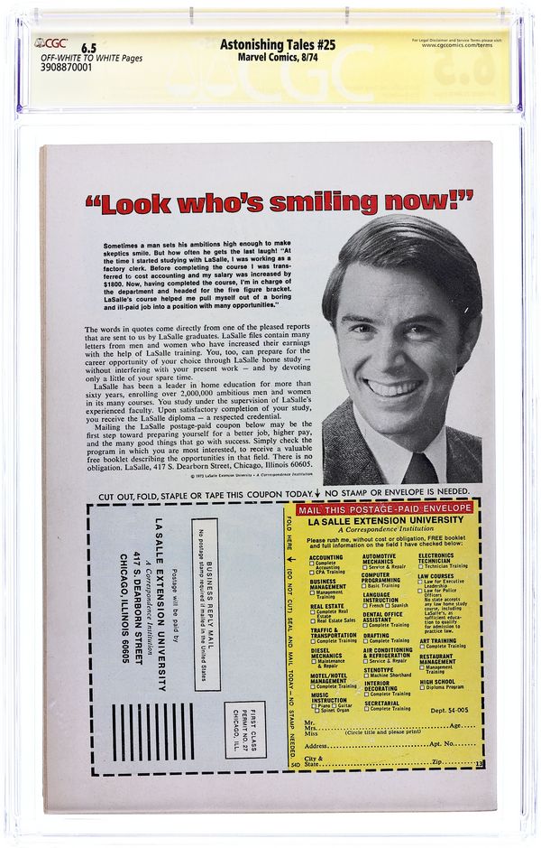 First 25-cent cover price. Cover pencils by Larry Lieber, inks by Frank Giacoia. Five Claws of Death!, script by Tony Isabella, pencils by Dick Ayers, Larry Lieber, Jack Kirby (reprinted material), and Gil Kane (reprinted material), inks by Vince Colletta, Dick Ayers (reprinted material), and Mike Esposito (reprinted material); Fin Fang Foom is again controlled by Dr. Vault and he attacks It forcing him to slip away before he is defeated; Bob O'Bryan then sends his mind back to his body where he wakes up before they can perform an autopsy on him. Advertisement for three official Marvel Solid-Bronze Collectors Medallion-Coins. Stan Lee's Soapbox. Promo for Crazy Magazine #4 and Savage Tales #4. 32 pgs. $0.25. Cover price $0.25.