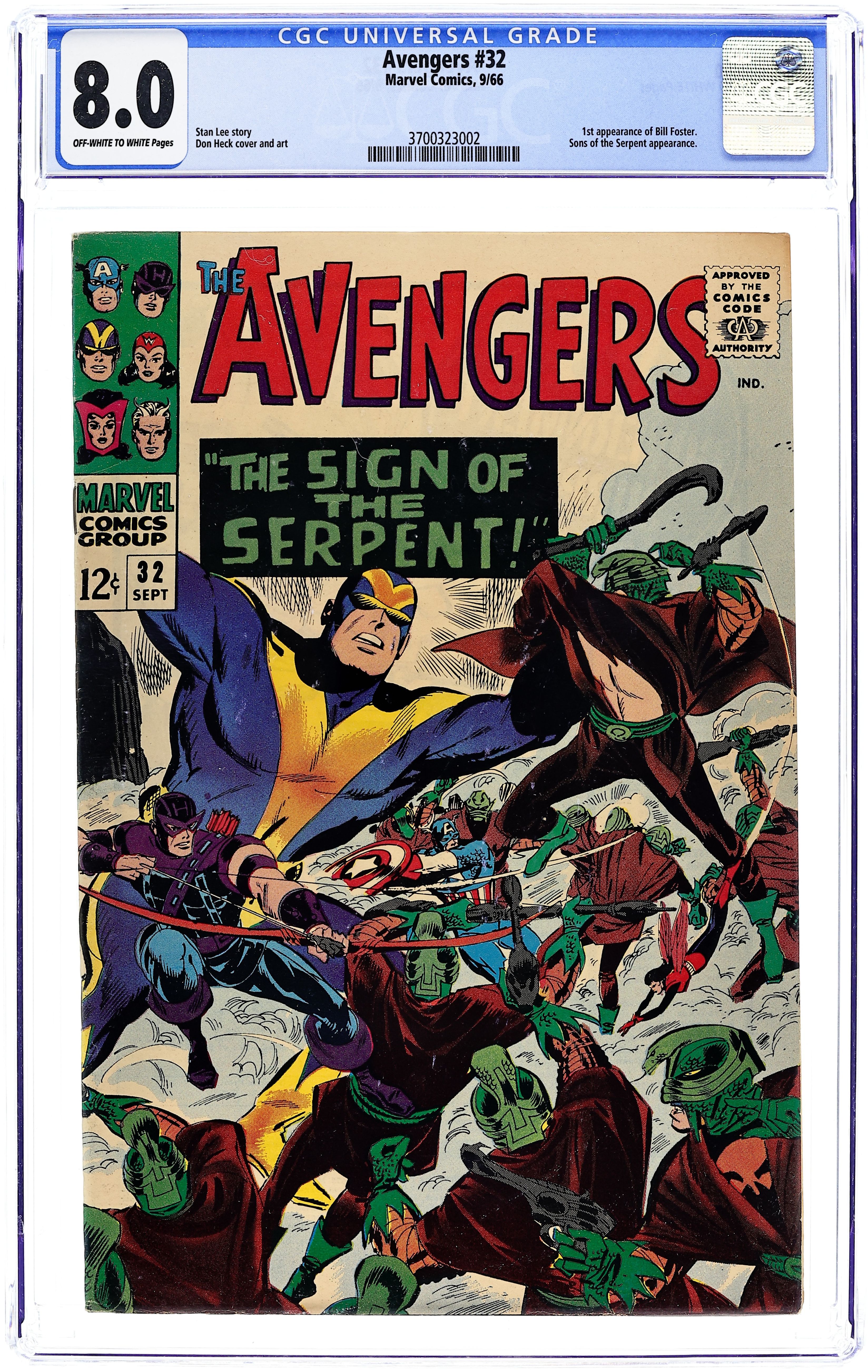 Cover by Don Heck. "The Sign of the Serpent!", script by Stan Lee, pencils by Don Heck; Captain America encourages Goliath to keep looking for a solution to his height-switching ability and finds a new assistant, Bill Foster; The Sons of the Serpent attack foreign people, including General Chen, the dictator of a communist country while he visits the UN; The Black Widow provides information to Hawkeye to prove herself to him. Quicksilver and the Scarlet Witch discover they will regain their full powers; Bill Foster, being African-American, gets attacked by the Sons of the Serpent; Captain America goes to Nick Fury for more information about them; The Avengers vow to defeat the Sons of the Serpent, but Captain America is kidnapped. Avengers roll call: Captain America, Hawkeye, Goliath, the Wasp, and, briefly, Quicksilver and the Scarlet Witch. Tony Stark (Iron Man) and Nick Fury guest appearances. Reprinted in Giant-Size Marvel Triple Action #2. 36 pgs., full color. $0.12. Cover price $0.12.