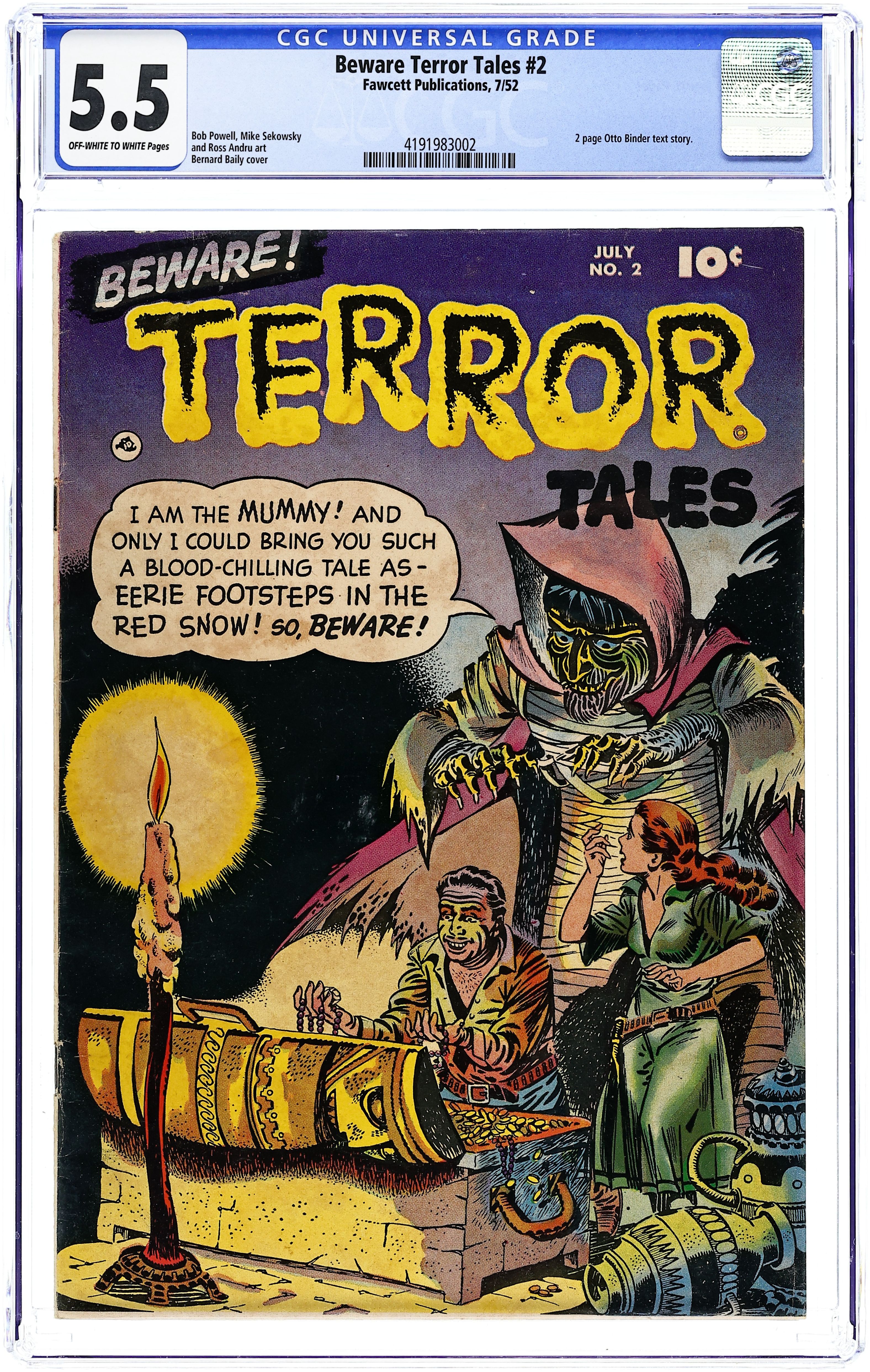 Cover by Bernard Bailey. Stories and art by Bob Powell, Otto Binder, Ross Andru and Mike Sekowsky. Classic pre-Code horror from St. John. Mountain climber Rigo is so determined to be the first to scale Mount Olympiad, he murders his fellow climbers, in a story with art by comics legend Bob Powell. A modern-day schoolteacher visits the New England town where his ancestor was executed for congress with the Devil, in a story with art by comics legend Ross Andru (and possible inks by Mike Esposito). A murderer is pursued by the fiery ghost of his victim, which he sees in every fire, in a story by Supergirl co-creator Otto Binder. Eerie Footsteps in the Red Snow!; Fiend of Fire; The Devil's Creation; The Slaying of Joshua Sprague! 32 pages, Full Color. Cover price $0.10.